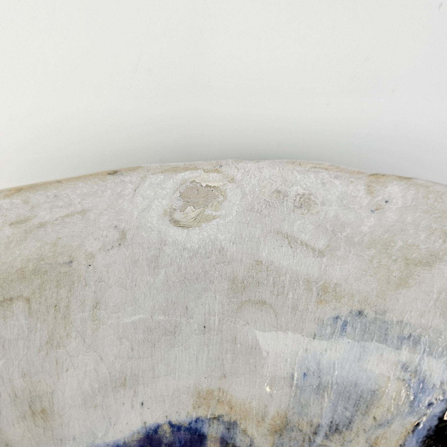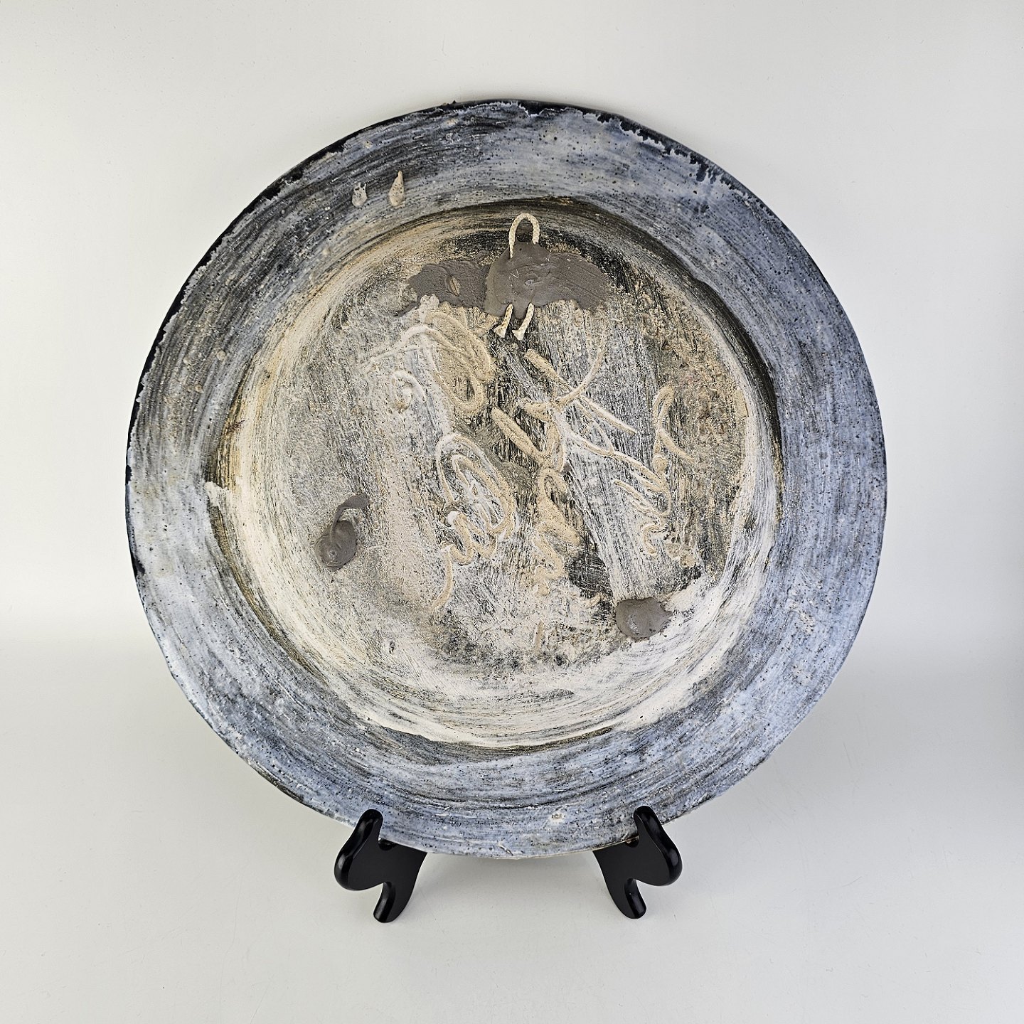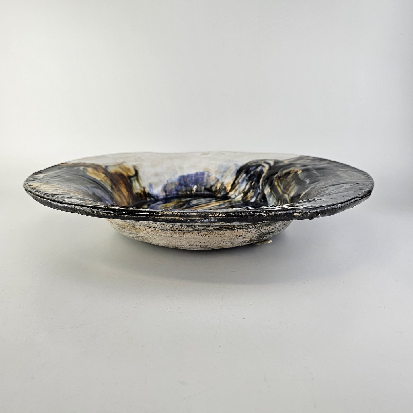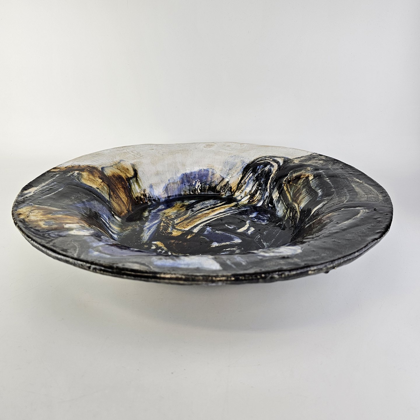 Stort rundt fad i glaseret keramik med abstrakt mønster i sorte, blå og brune nuancer