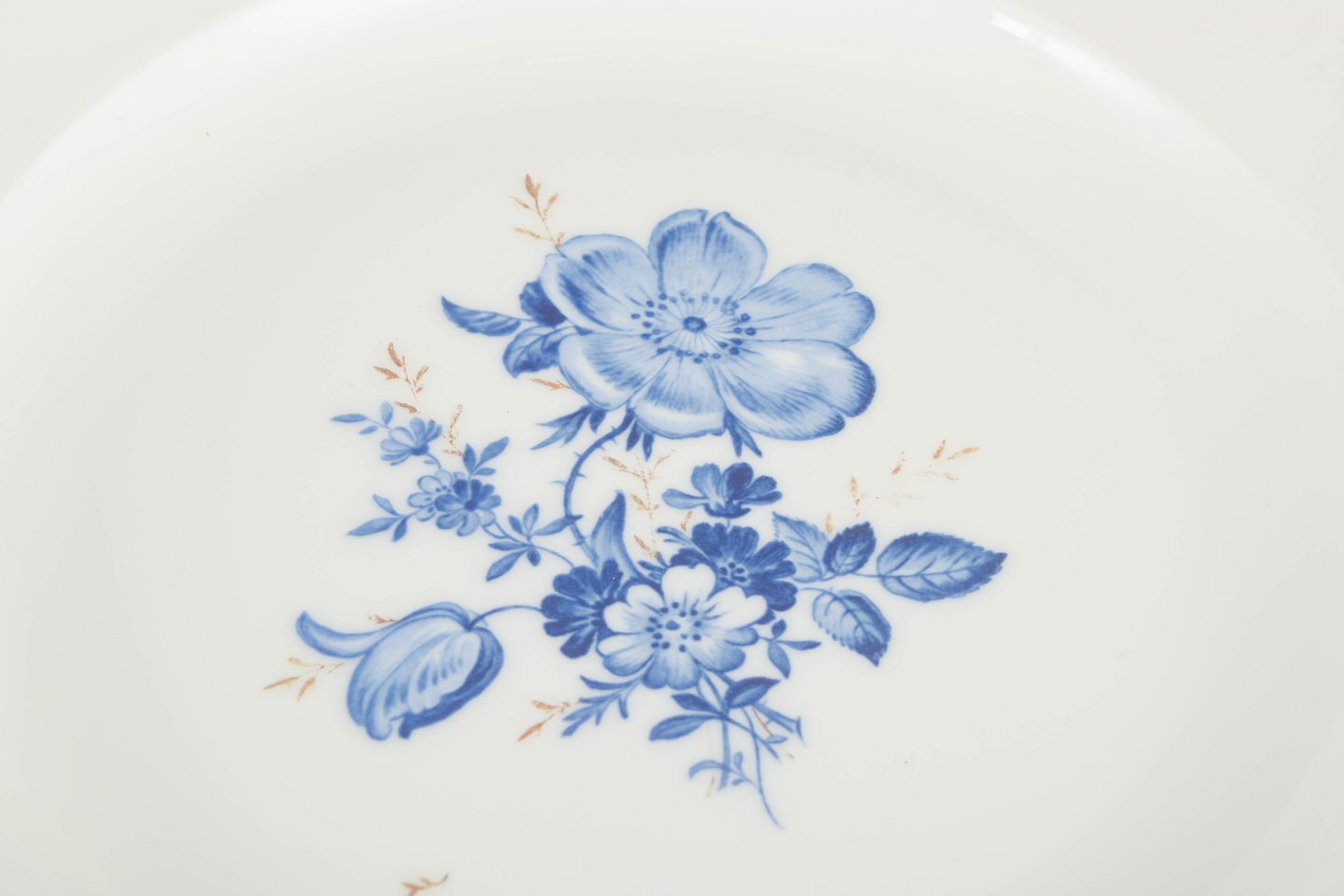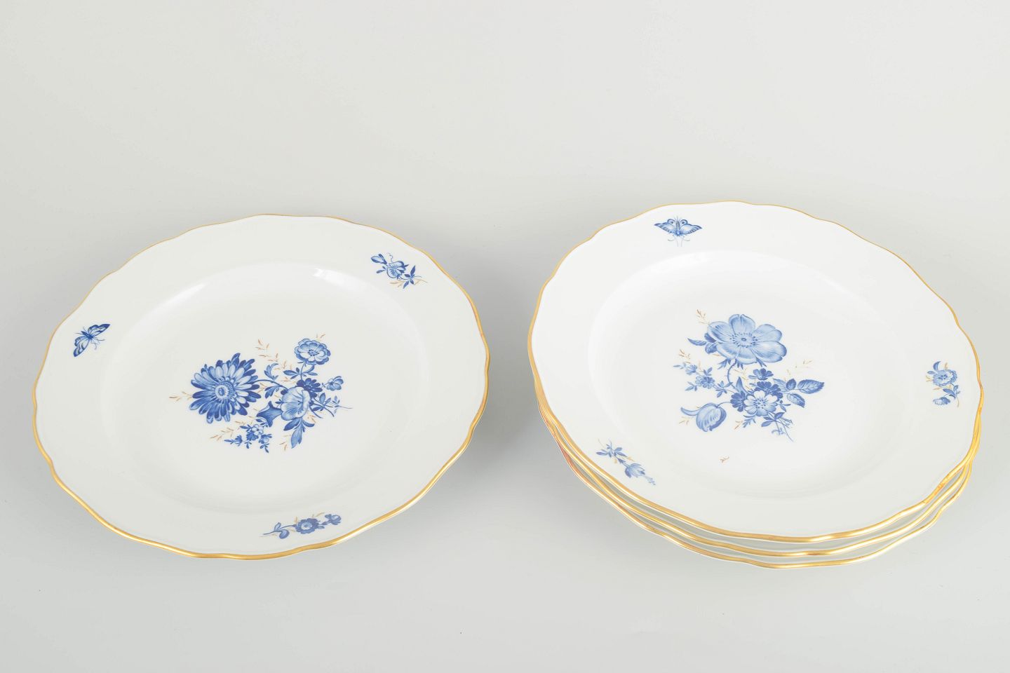 Hånddekoreret porcelæn med håndmalede blå blomsterdekorationer og forgyldte stafferinger langs kanten. Klassisk let bølget form.