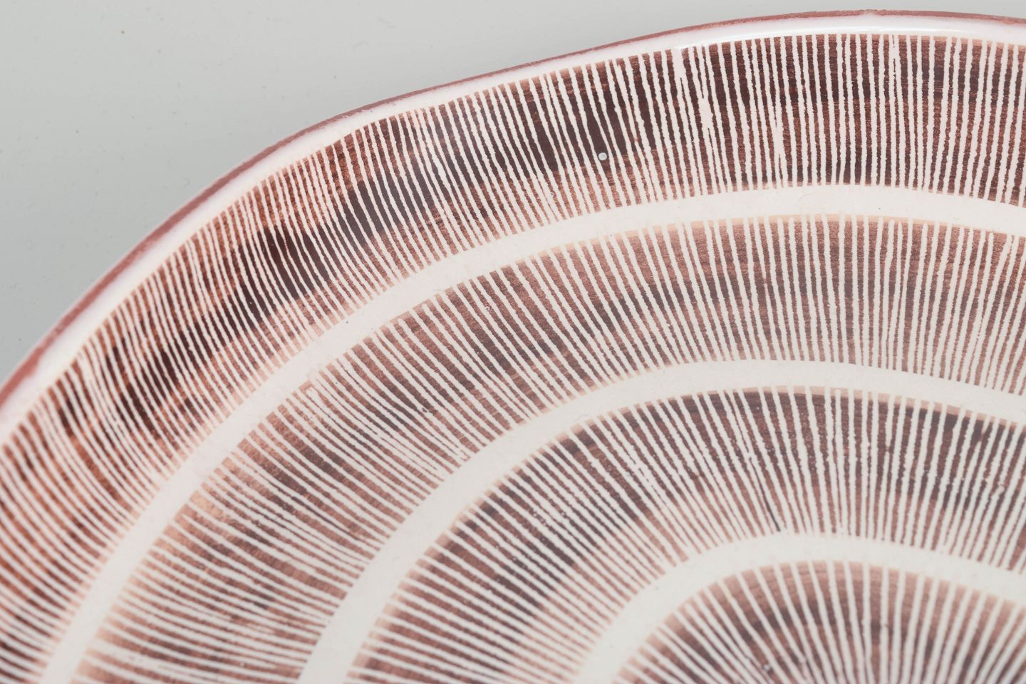 Organisk formet serveringsfad i glaseret stentøj med grafisk radialdekoration i rødlige og hvide toner.