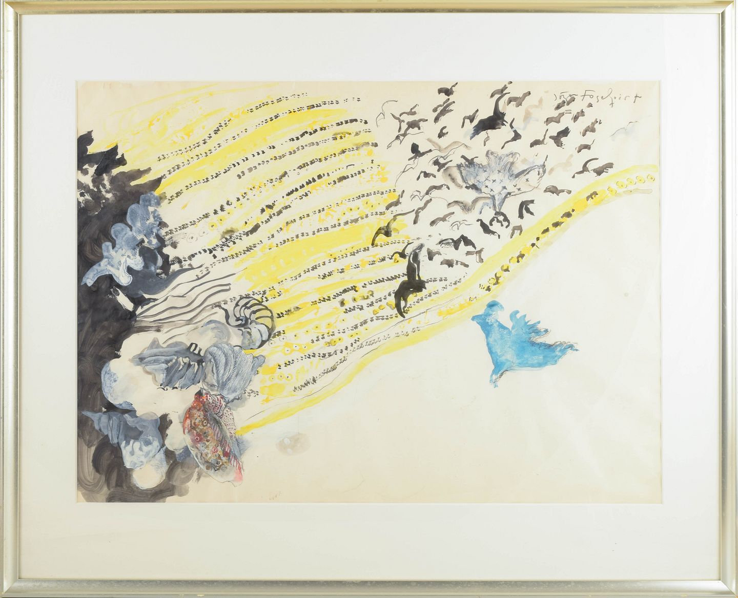 A poetic and movement-driven watercolor where musical yellow rhythms sweep diagonally across the composition, dissolving into a flock of flying bird silhouettes. Deeper organic forms appear to the left in blue-grey tones, contrasted by a lighter, floating blue figure on the right. A work of dreamlike lightness and spiritual energy.