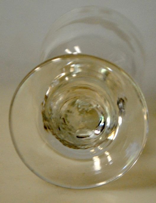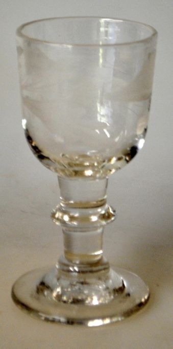 Snapseglas med egeløvs slibninger, 19. årh. Danmark. Stilk med knap. Slibninger med 4 blade og 8 agern foroven og forneden. H.: 8 cm.