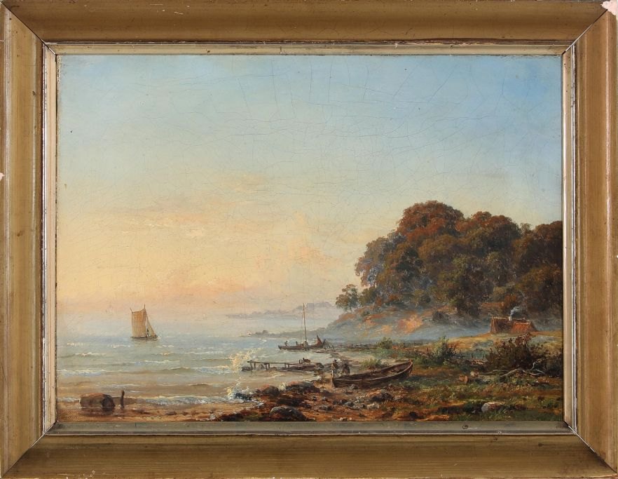 Kiærschou, Frederik Christian (1805 - 1891) Danmark: Fiskerne vender hjem fra havet. Fiskerne vender hjem fra havet. Olie på lærred. Meget svagt signeret.
