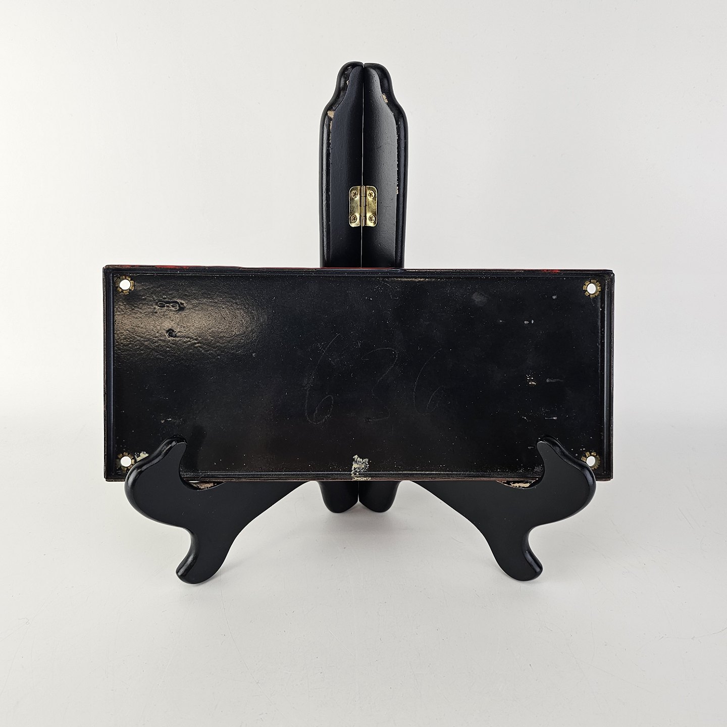 Rødt emaljeskilt med teksten Kontortid for post og åbningstider
