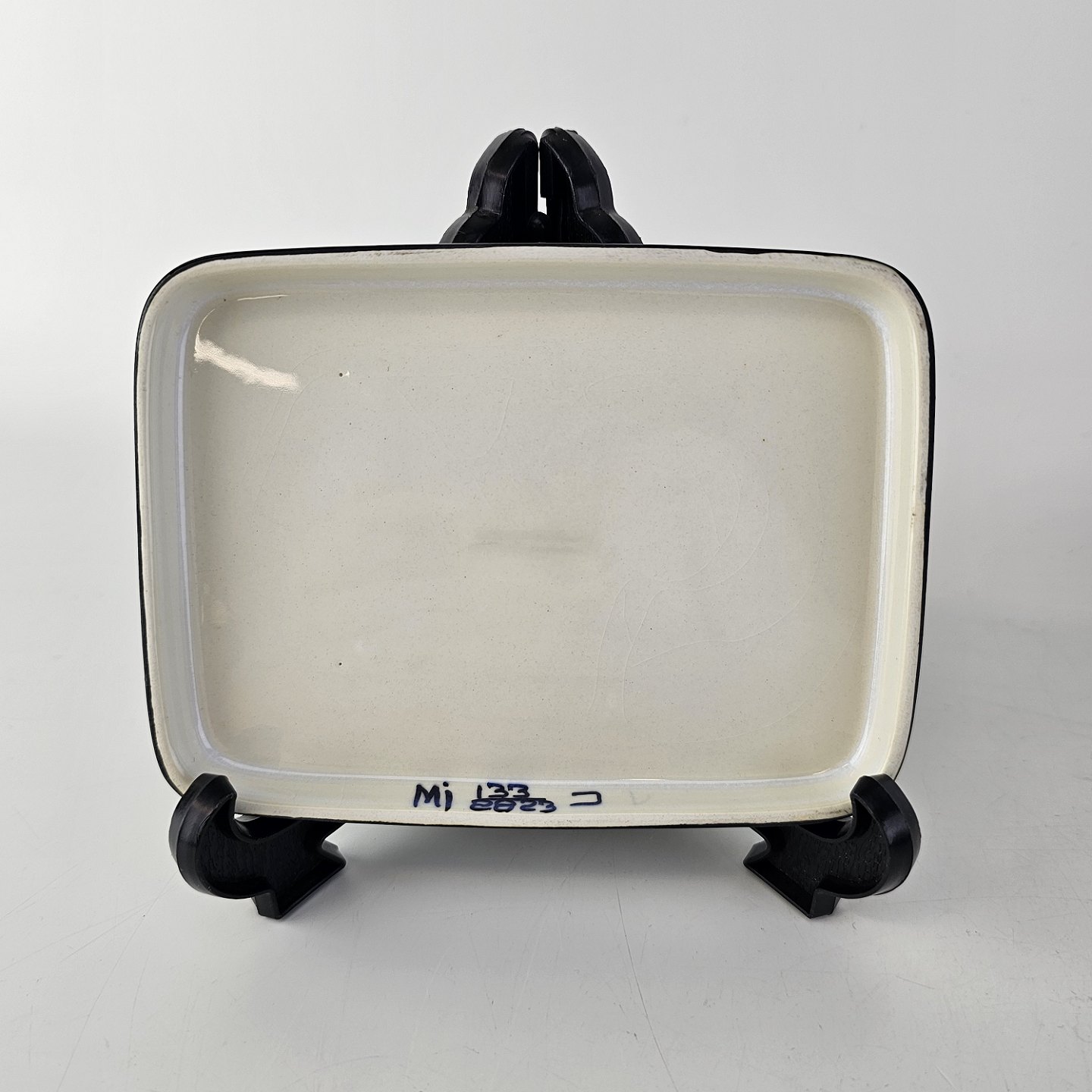 Smørboks fra serien Tenera. Boksen er i hvid fajance med blåmalet yderside og låget er dekoreret med motiv af en påfugl