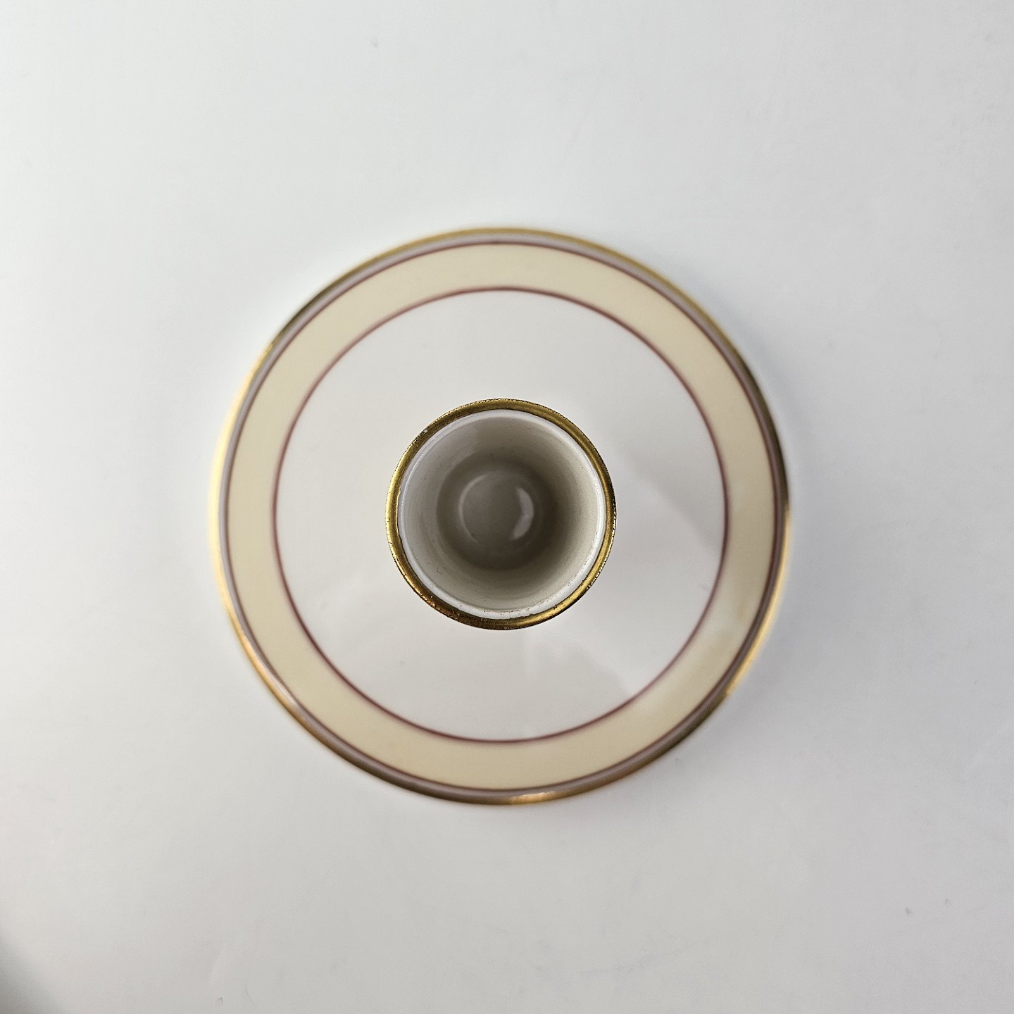 Service i glat hvidt porcelæn pyntet med dekoration i beige, brændt orange og gylden streg.