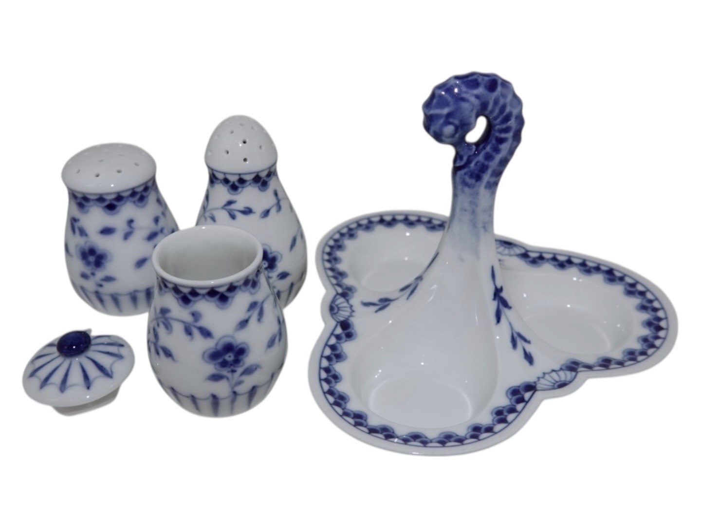 Bing & Grøndahl Sommerfugl Dickens, Plat de menage med sennepskrukke, salt- og peberbøsse med propper.
