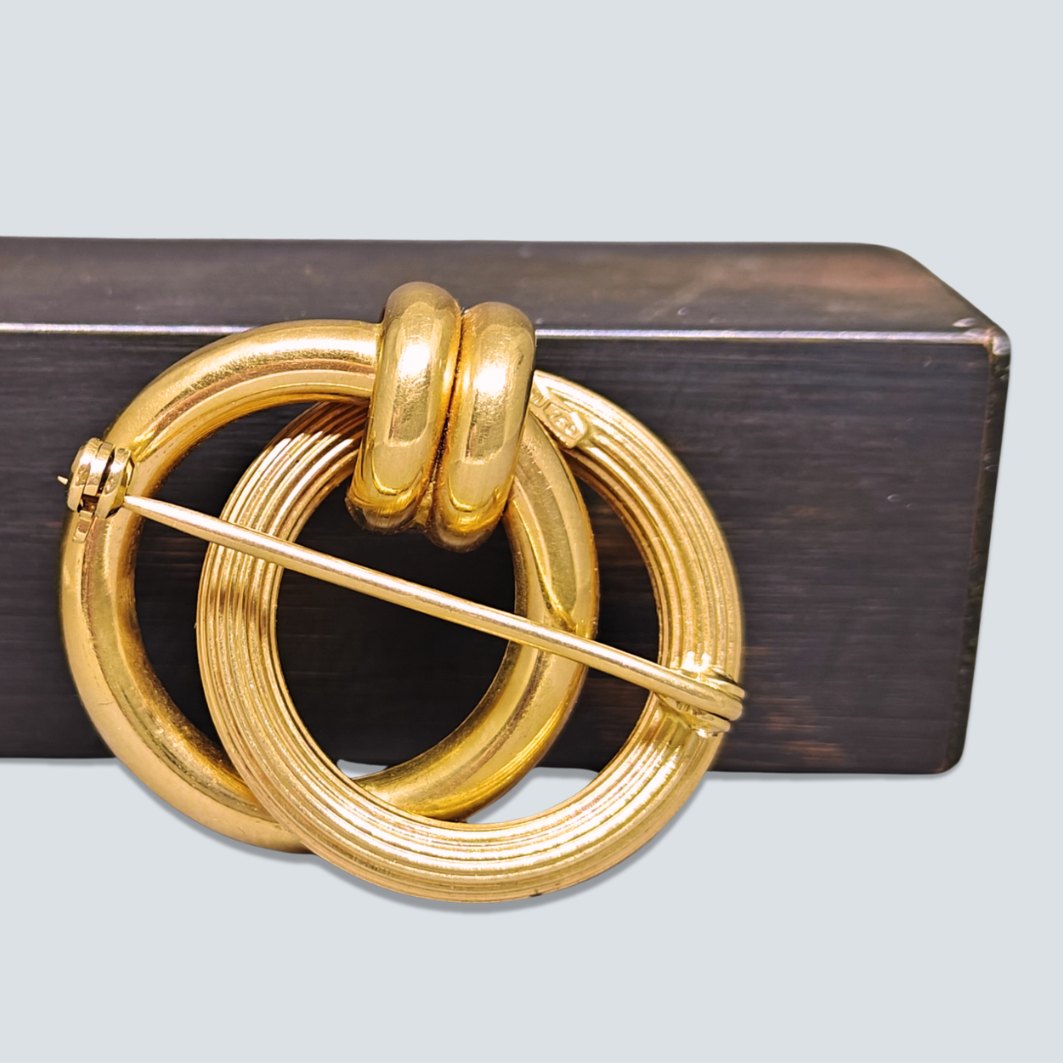 Broche af 18 kt. guld. En cirkel med glat overflade, den anden med riller.