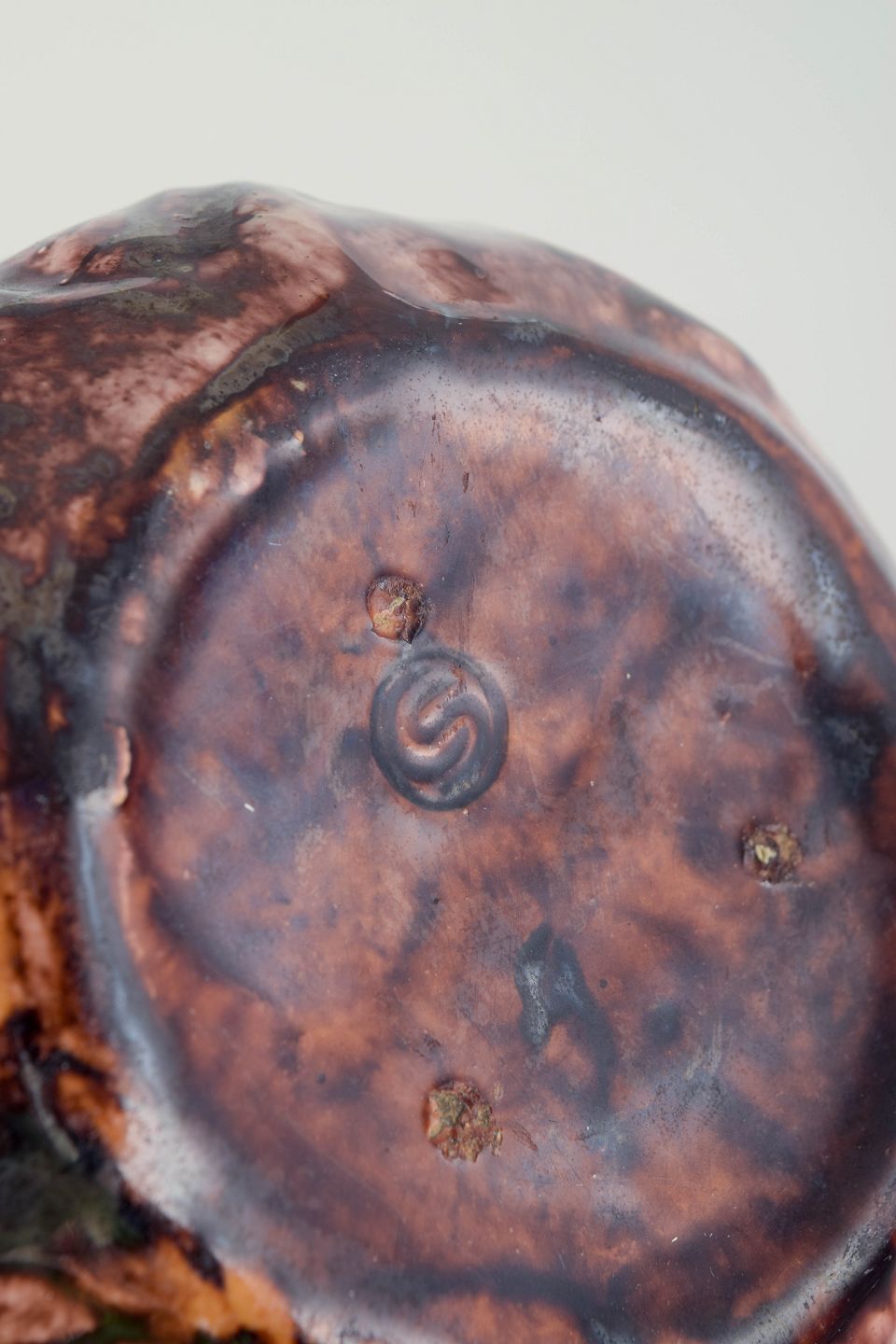 Håndformet stentøjsvase med blød buet krop og levende flammet glasur i dyb brun med flydende blå top og lodrette penselstrøg i jugendpræget udtryk. Unikt håndlavet værk.