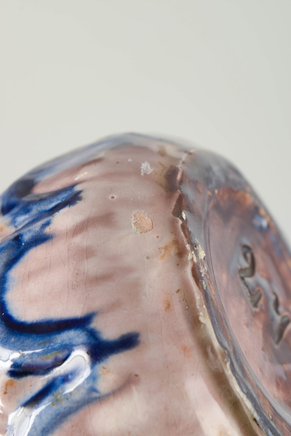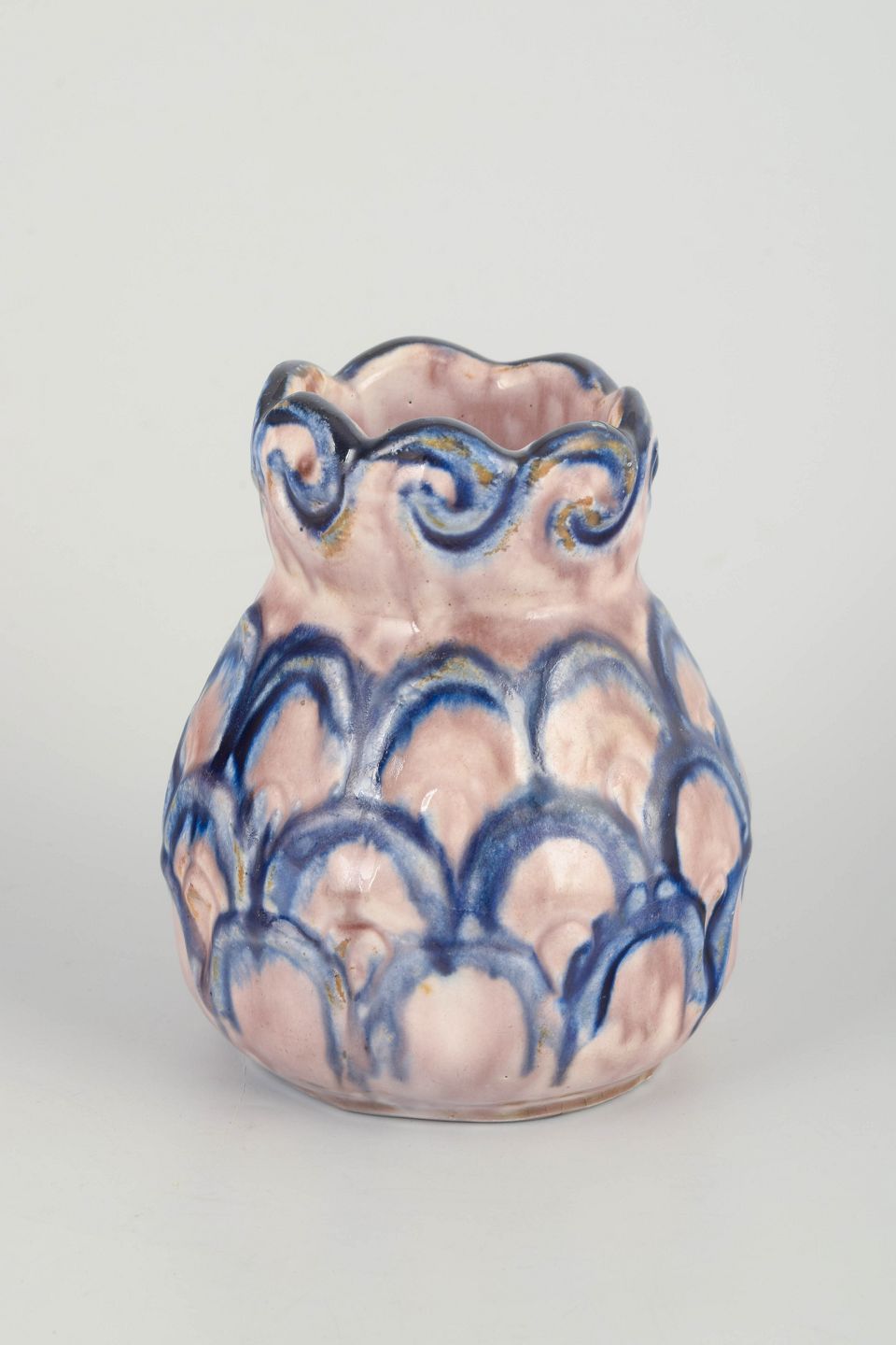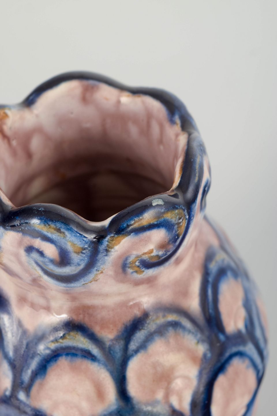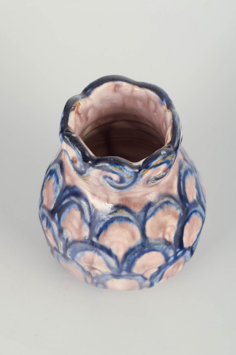 Håndformet stentøjsvase med bølget krave og organisk Art Nouveau-dekoration i rosa glasur med dybblå penselmalede buemotiver hele vejen rundt. Unikt håndlavet stykke fra den tidlige danske lervaretradition.