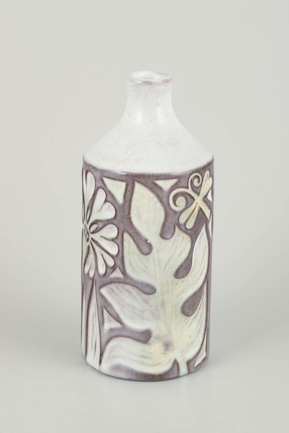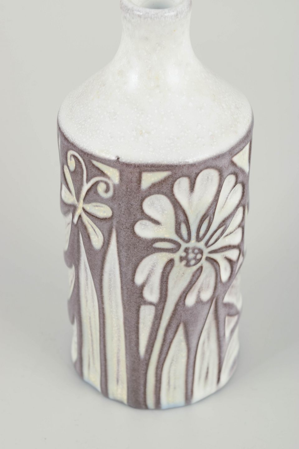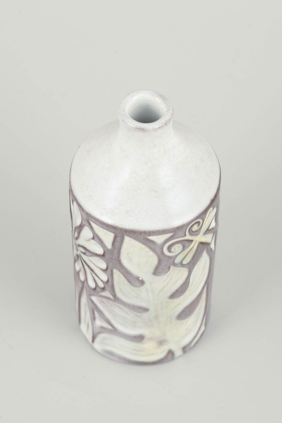 Relief-dekoreret cylindrisk stentøjsvase med botaniske motivfelter i hvid og grålig glasur, let konisk hals.