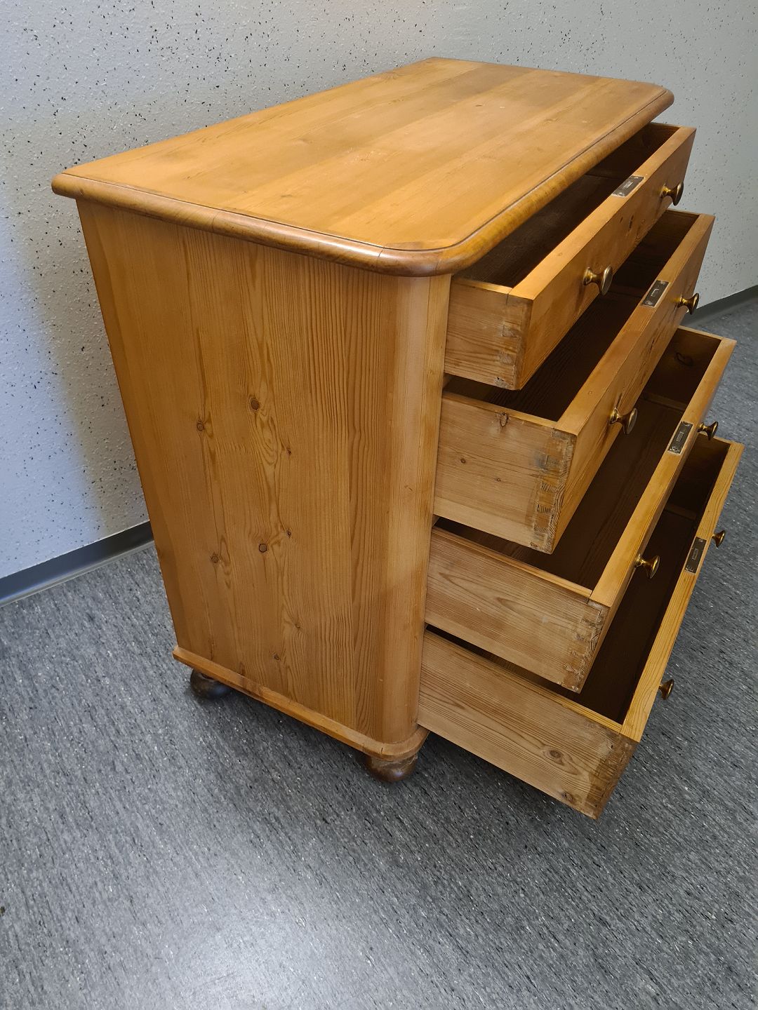 Kommode fra 1940'erne I massiv fyrretræ. Fremstår pæn, velholdt og udmærket funktionsdygtig. Dog med ganske få brugsspor på toppen (billede) og umiddelbart uden nøgle.