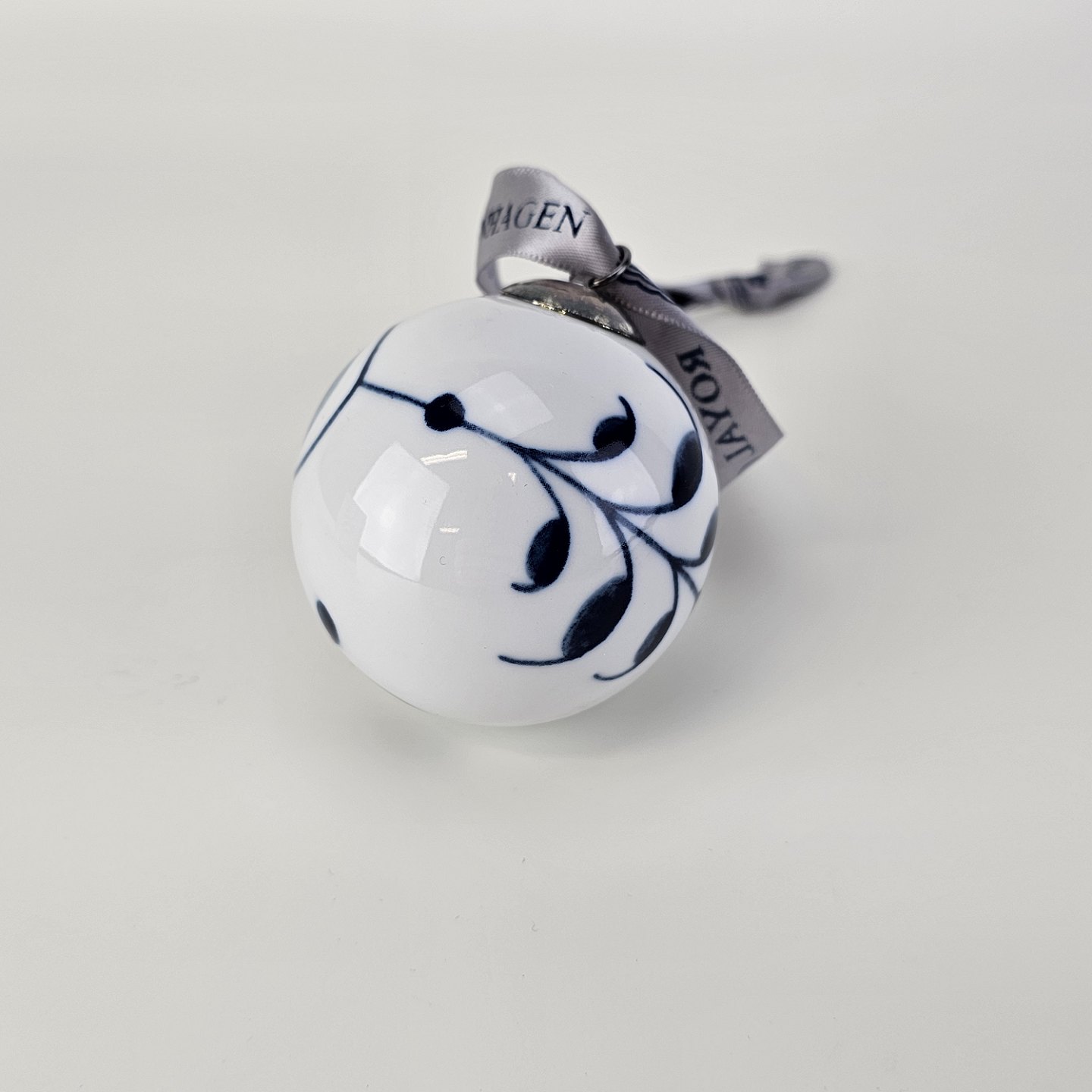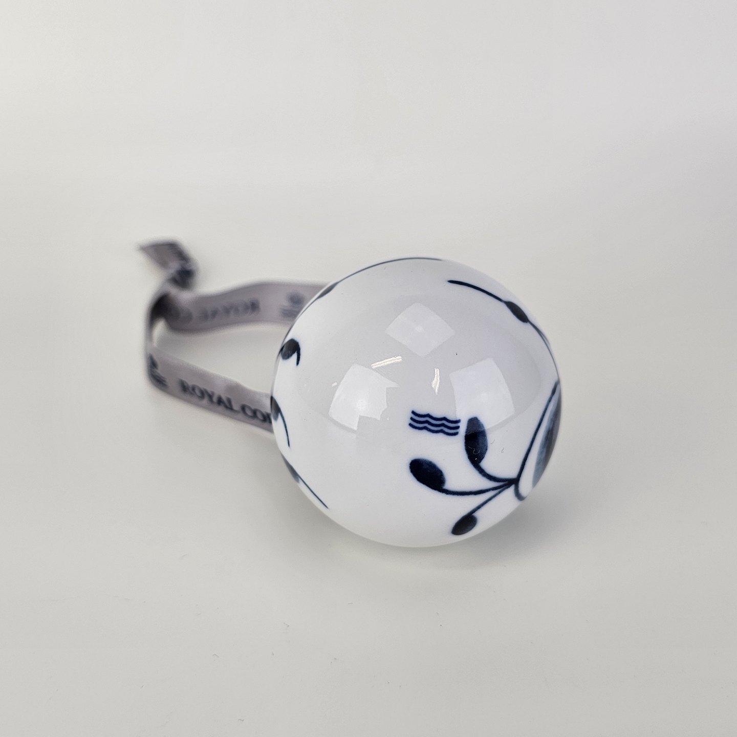 Håndmalet julekugle af porcelæn med blå mega musselmalet mønster. Der medfølger original æske.