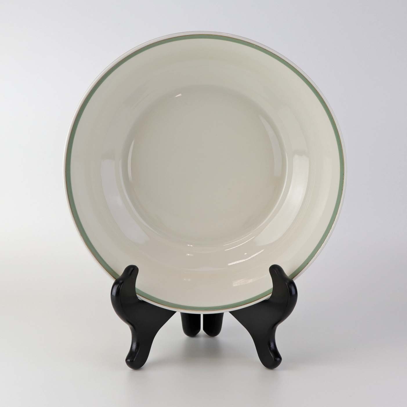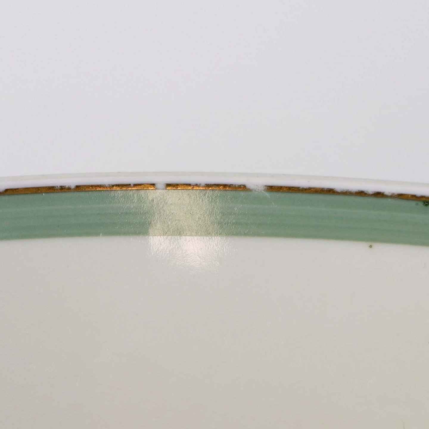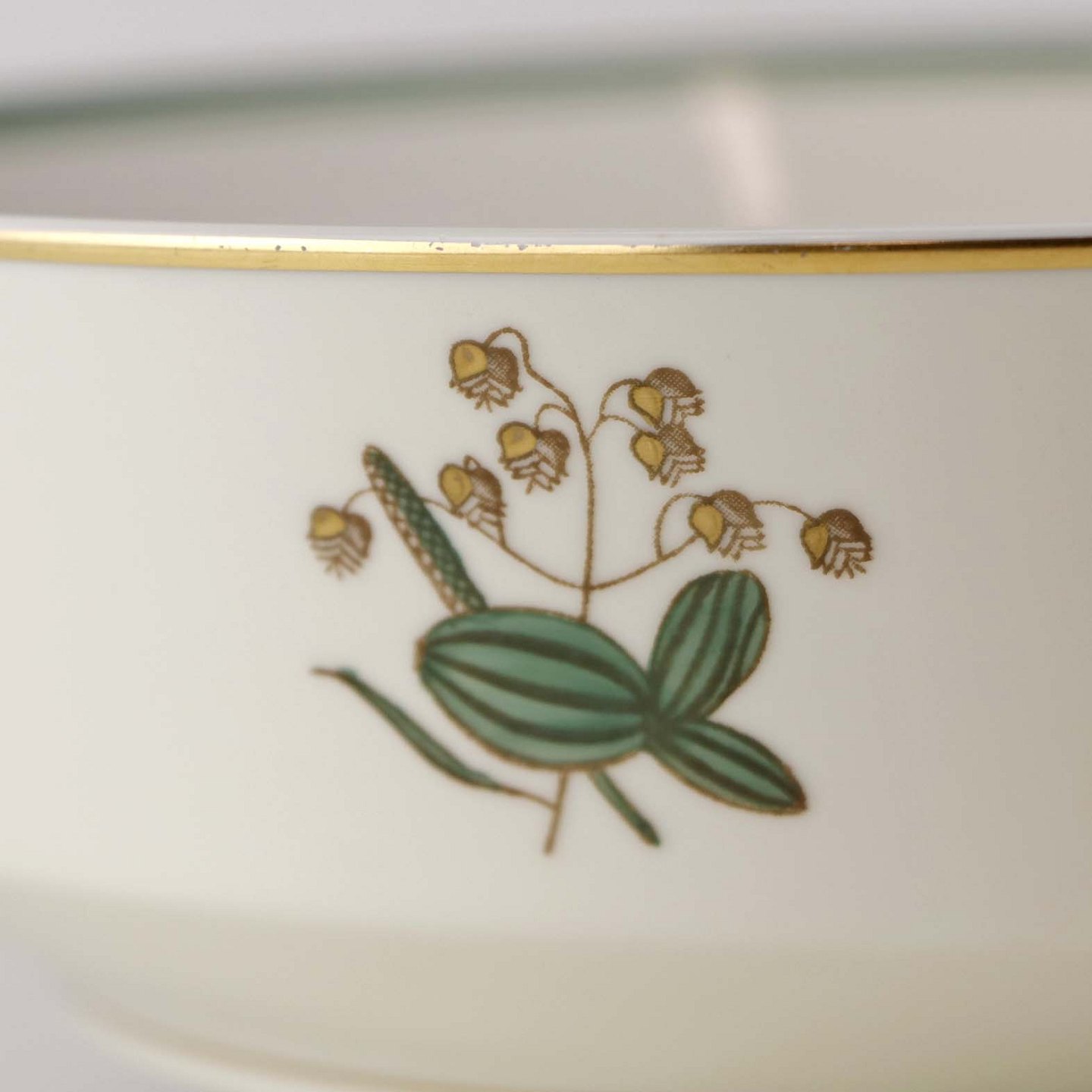 Stel i glat råhvidt porcelæn dekoreret med lysegrøn stribe og guldkant samt motiv af hjertegræs.