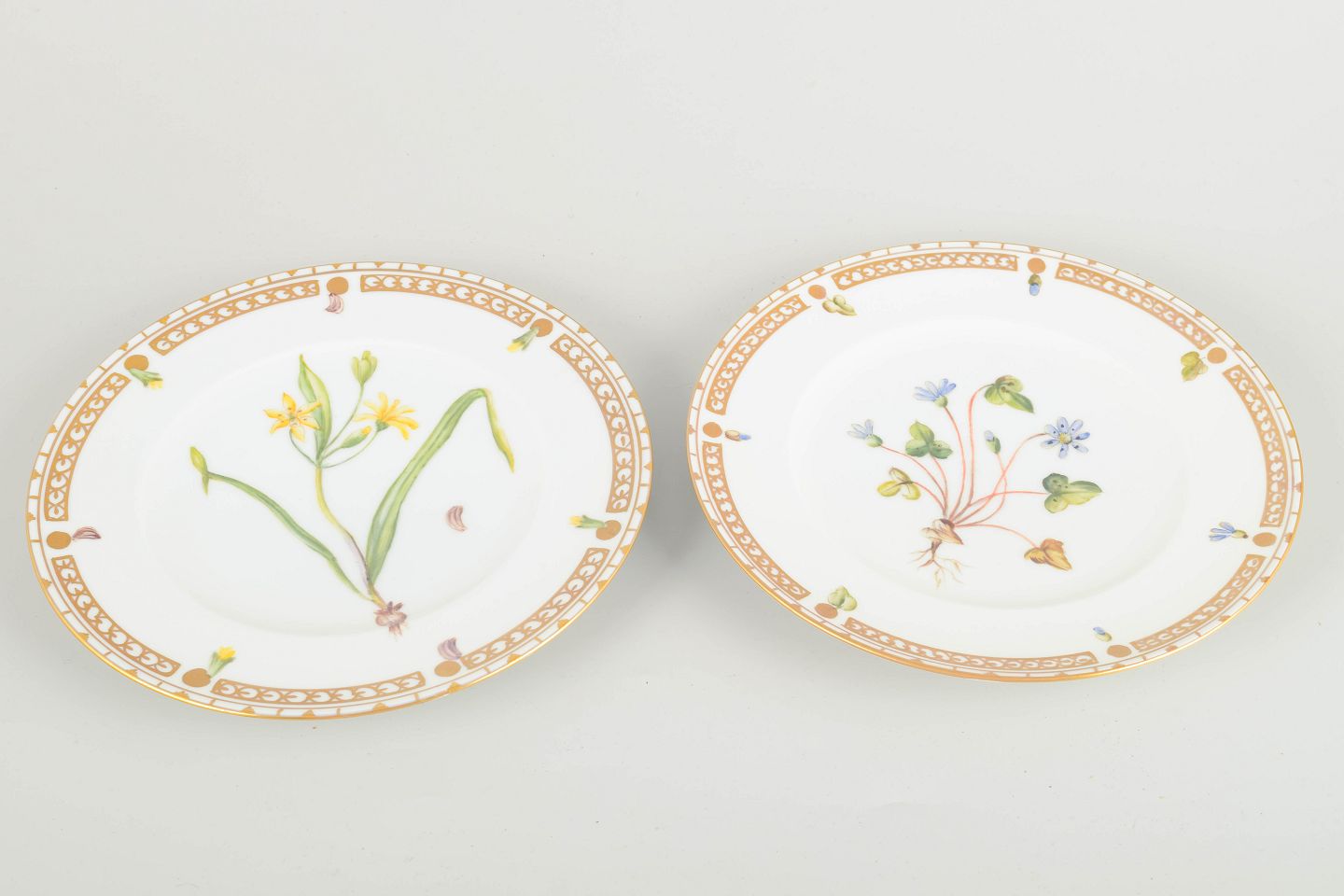 To porcelænstallerkener med håndmalede botaniske motiver og guldbemaling langs kanten. 2. sortering.