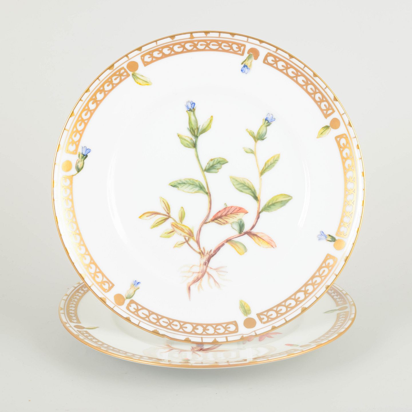 To porcelænstallerkener med håndmalede botaniske motiver og guldbemaling langs kanten. 2. sortering.