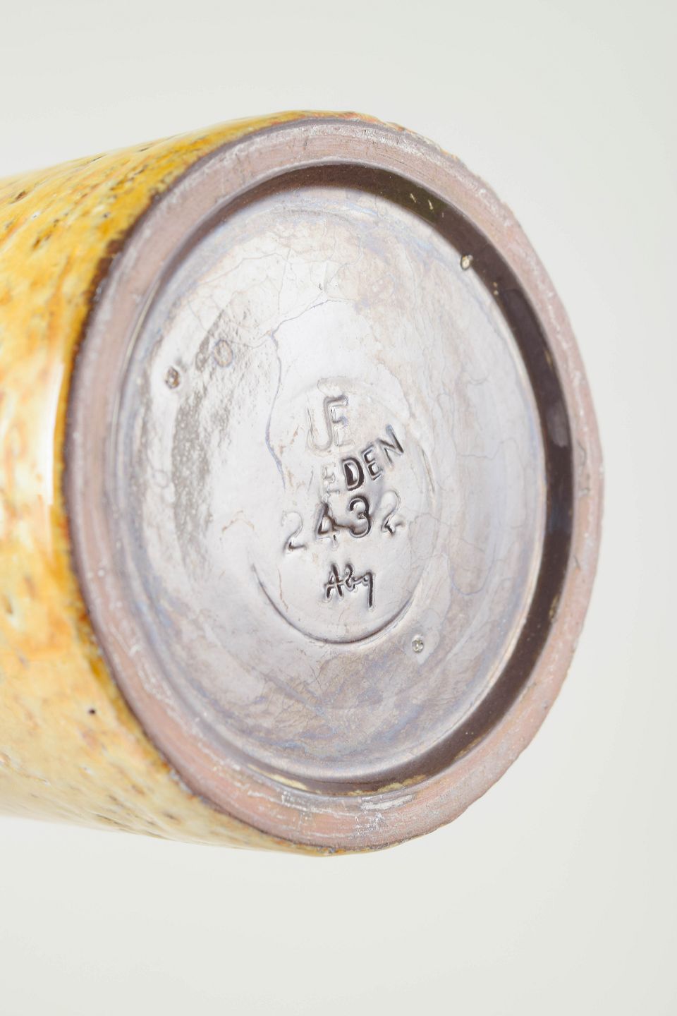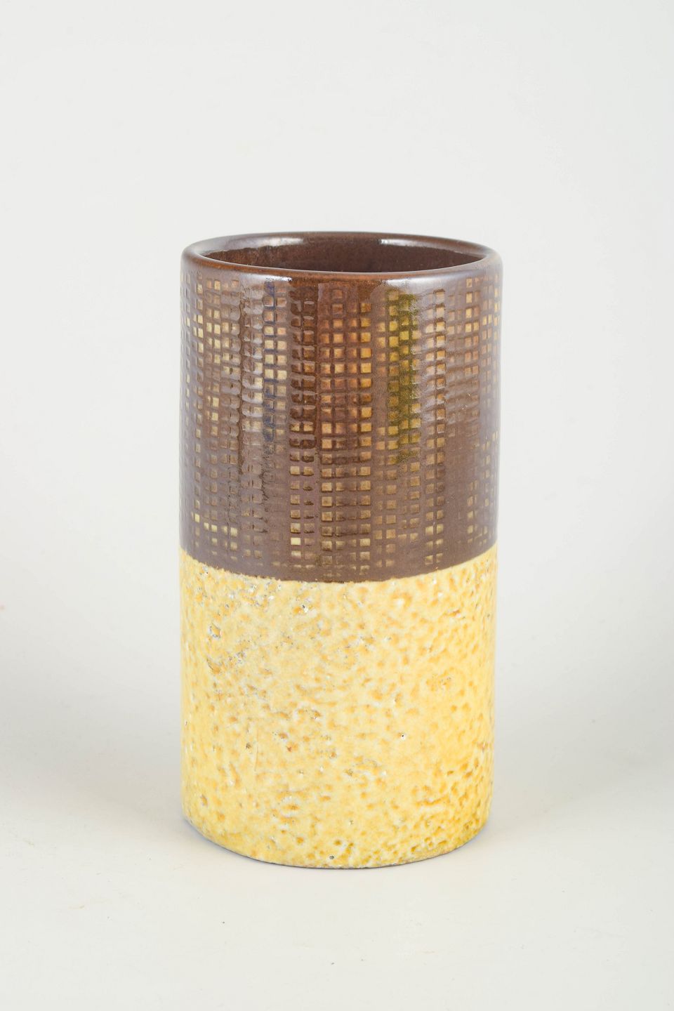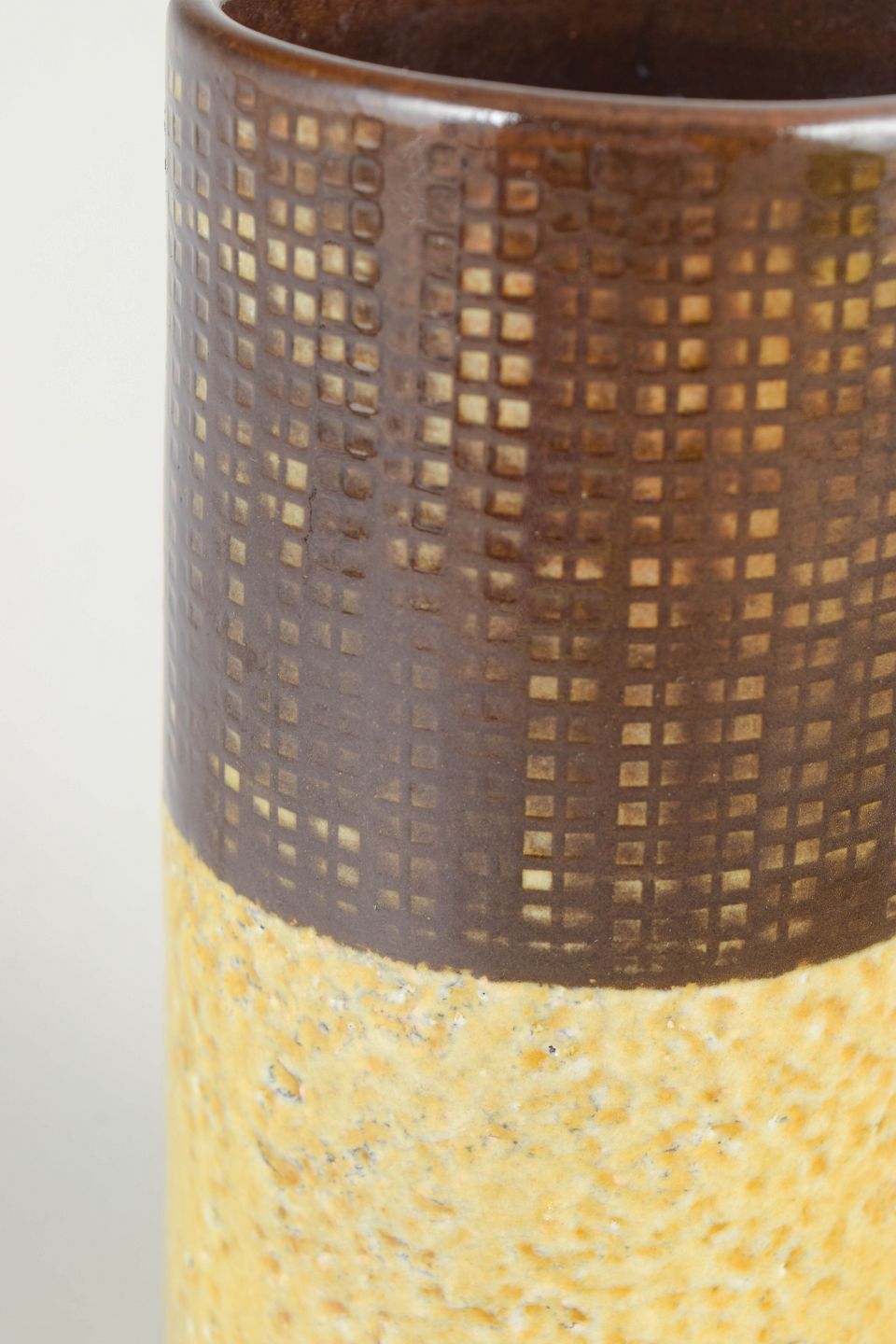 Cylindrisk stentøjsvase med todelt glasur — øvre sektion i brun geometrisk reliefstruktur og nederste del i lys gul taktil lavaglasur. Et signifikant eksempel på Atterbergs modernistiske formsprog og eksperimenterende overflader.