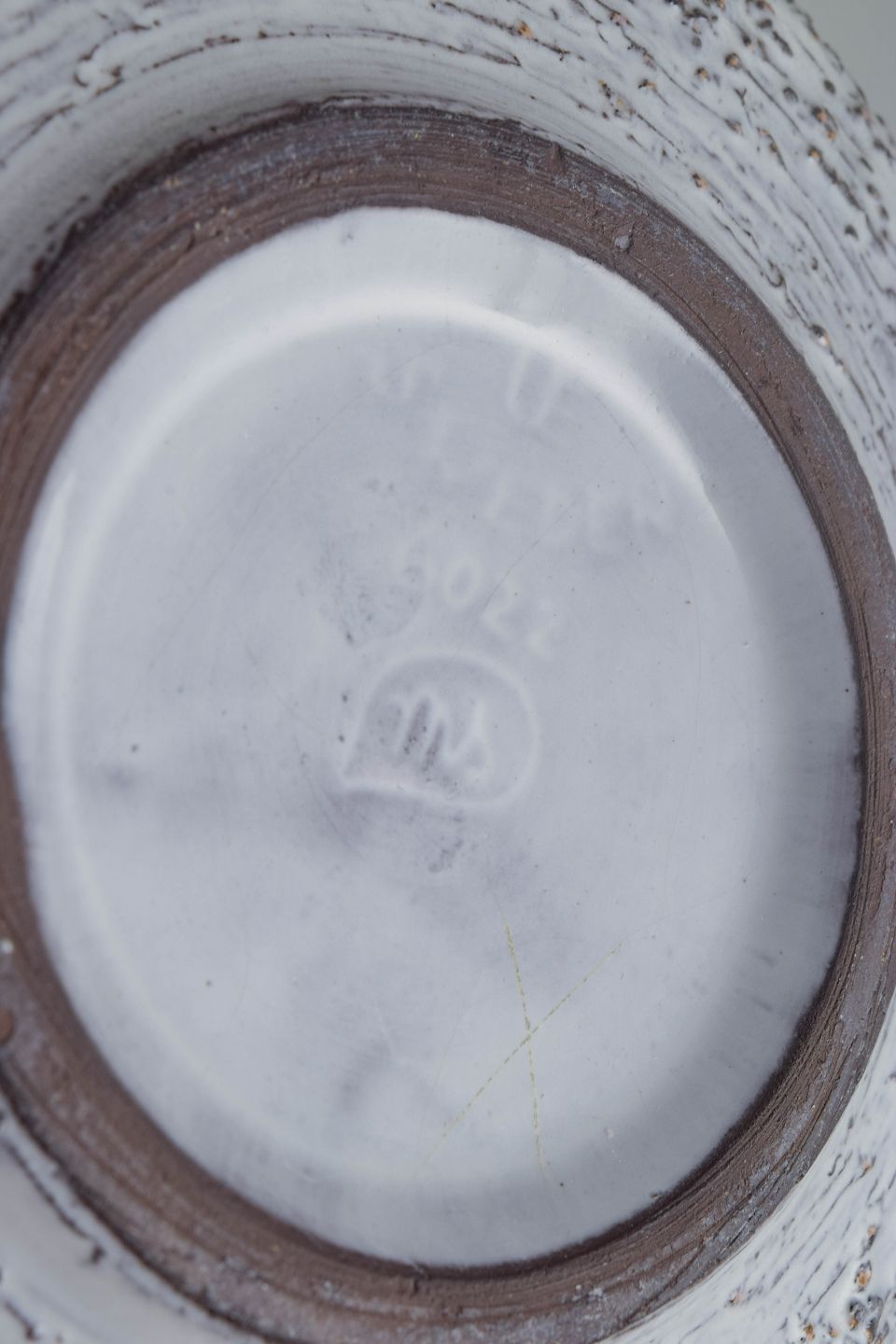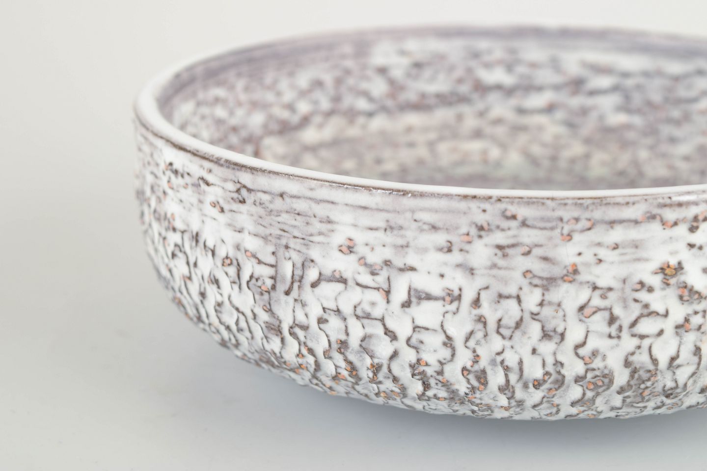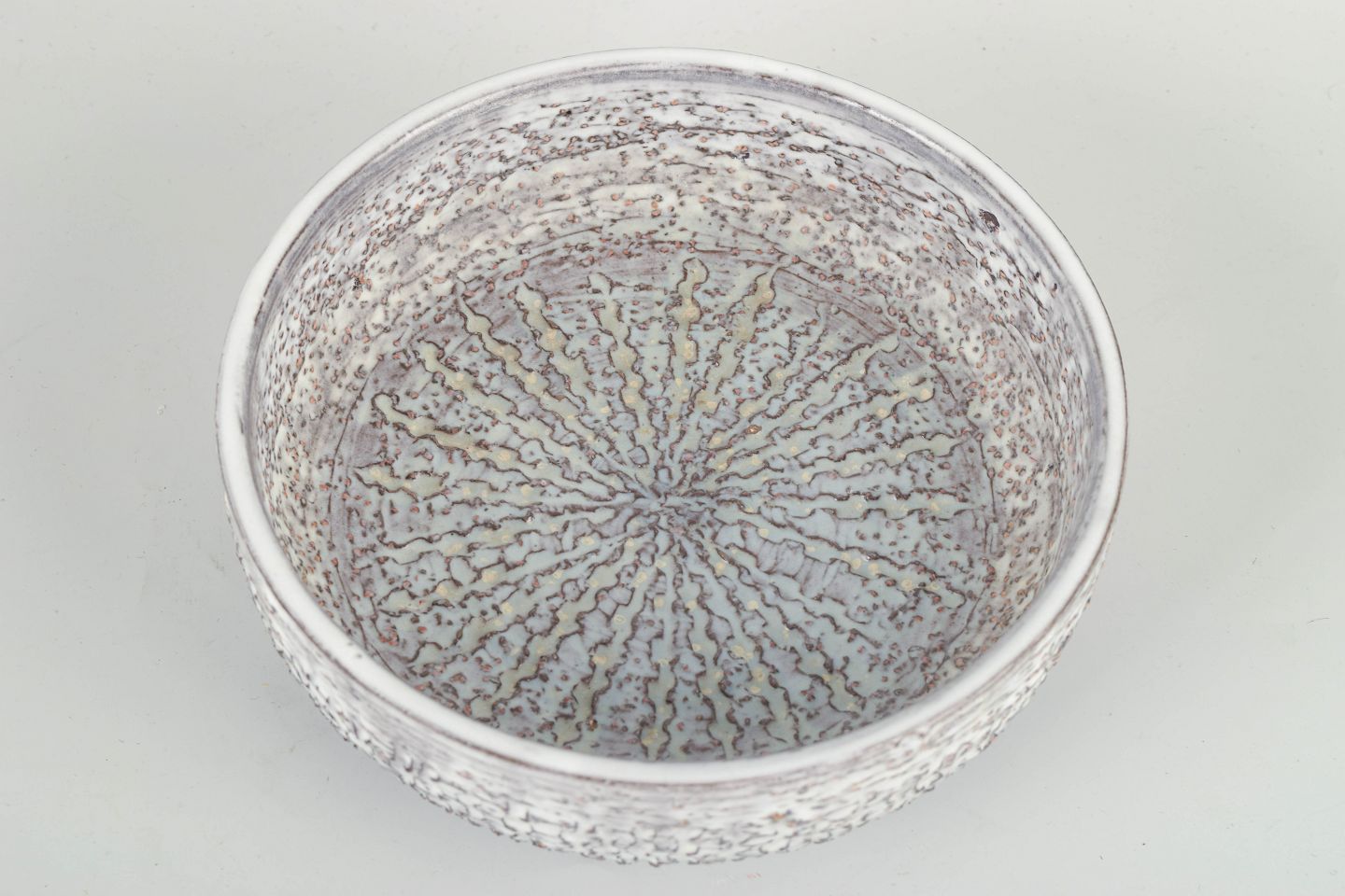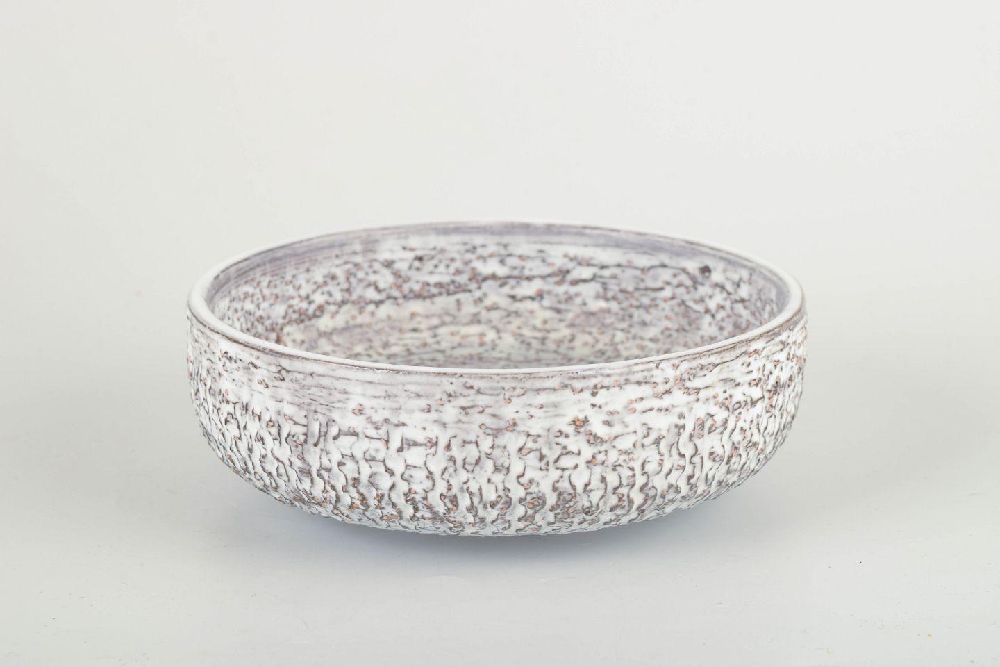 Lav, rundformet skål i stentøj med karakteristisk hvidgrå chamotte-glasur og organisk tekstureret overflade — typisk for Simmulsons 60’er-eksperimenter med taktile strukturer.