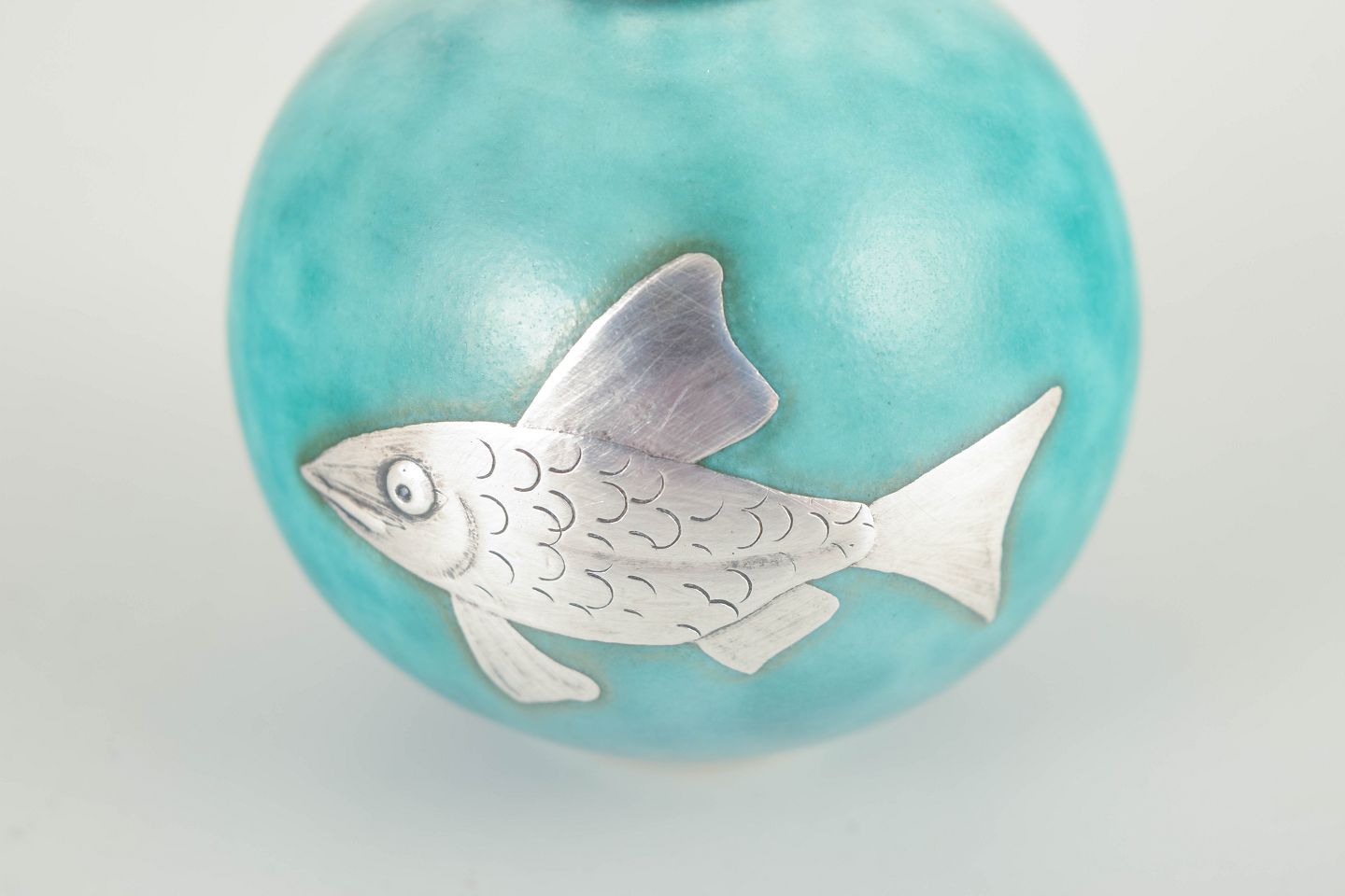 Lille rund Art Deco-vase i stentøj med karakteristisk turkis glasur og indlagt sølvfiskemotiv — et ikonisk kendetegn for Kåges Argenta-arbejder.