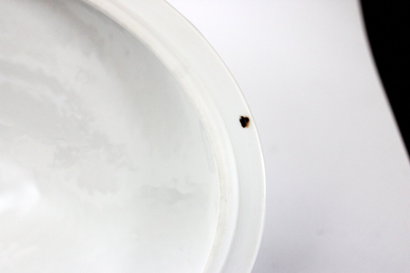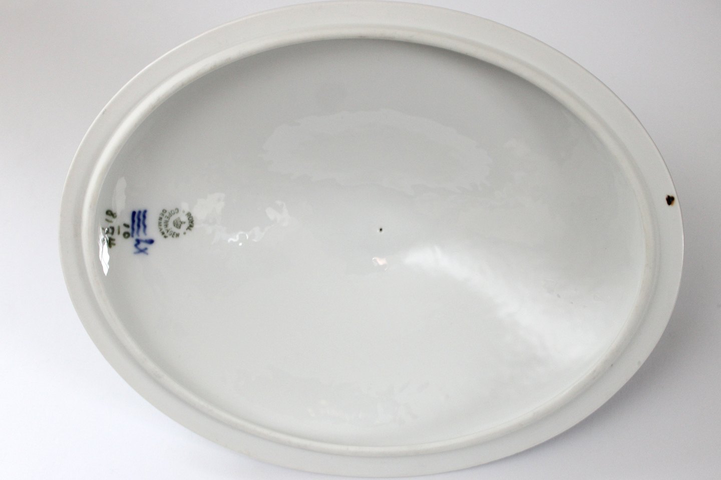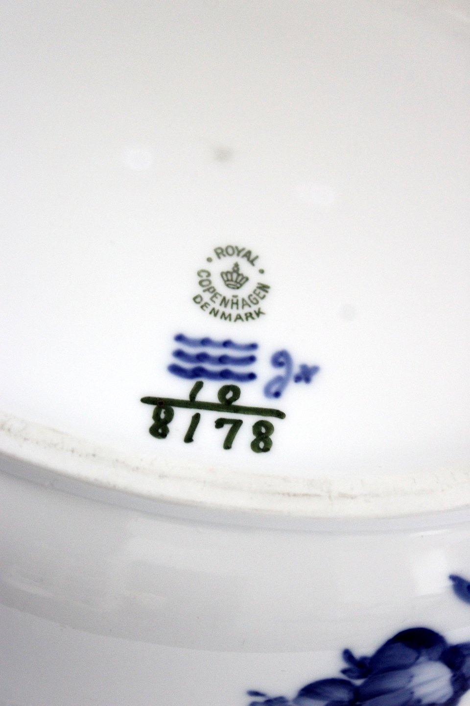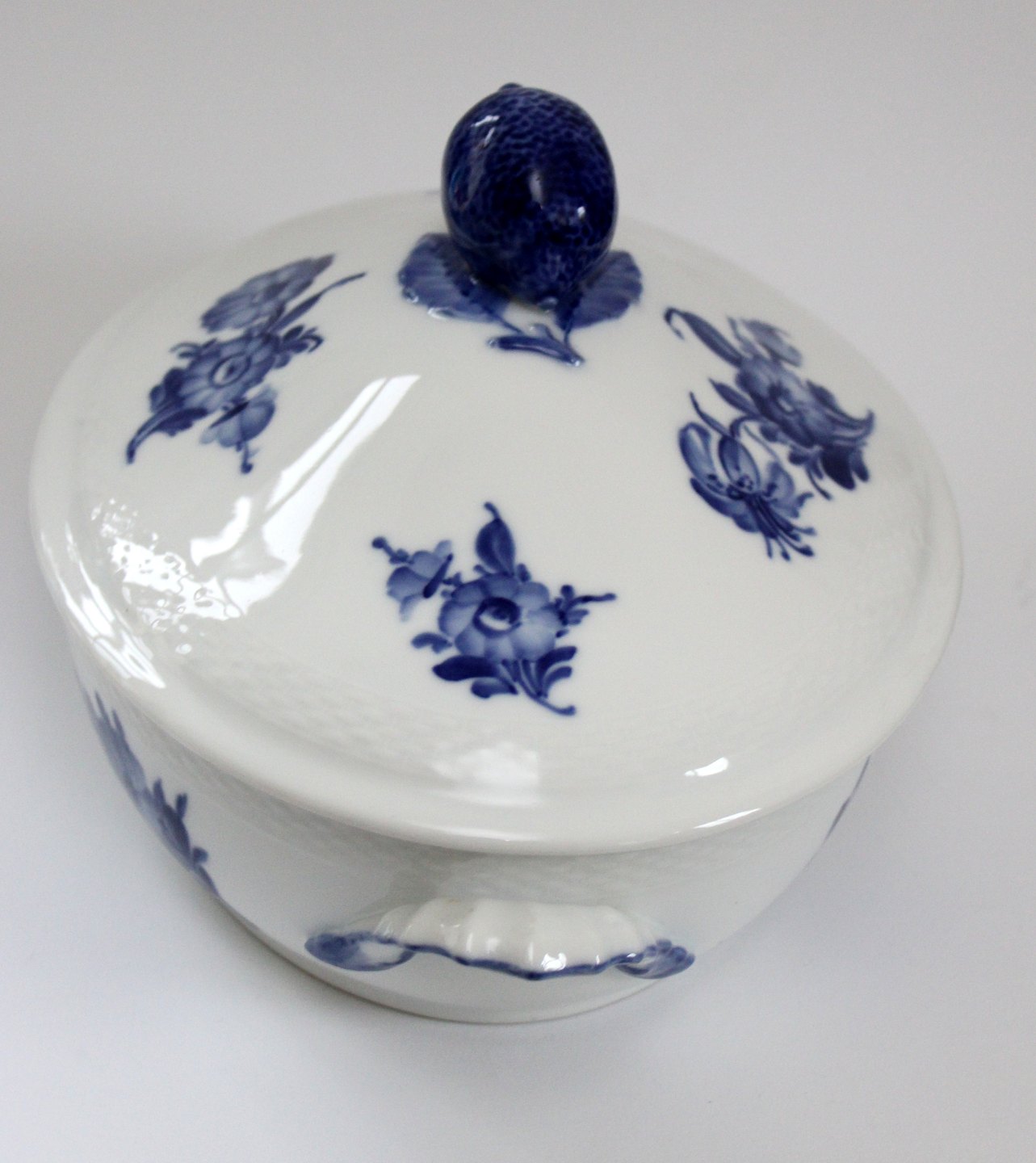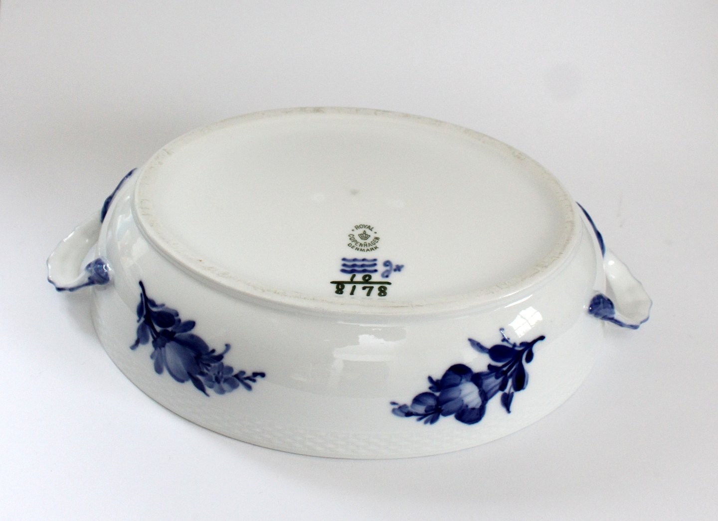 Royal Copenhagen, Blå Blomst flettet, Oval terrin med låg. Nr. 10/8172. Dateret 1945. Højde 15,5 cm. Længde 27,5 cm. Bredde 18 cm. I. sortering med sort brændingsplet på undersiden af låget. Pris: 1500 kr. stk. Lager: 1
