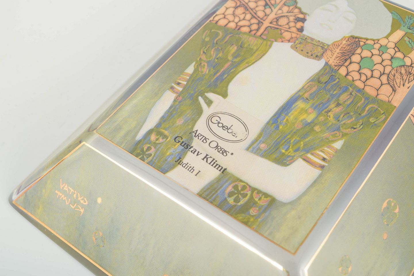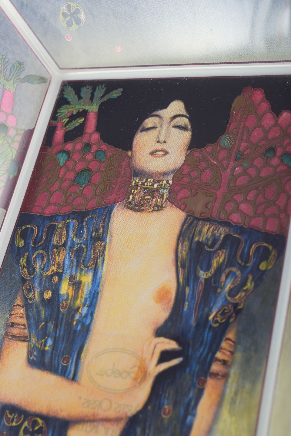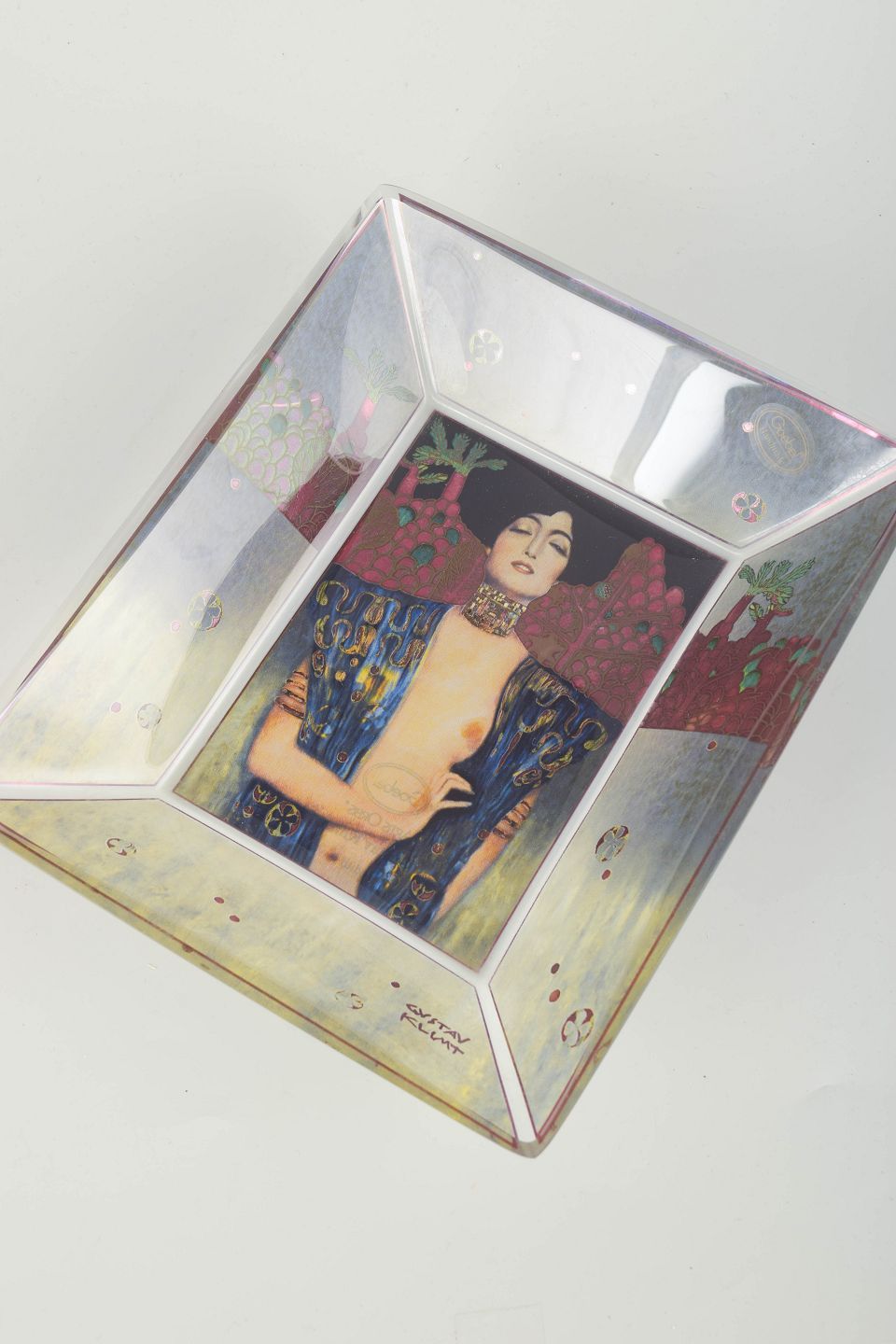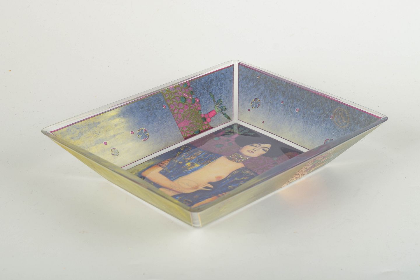 Rektangulær glasskål med motiv efter Gustav Klimts berømte maleri Judith I (1901), udført i iriserende glas med trykt dekoration og metallisk skær i guld, blå og røde nuancer.