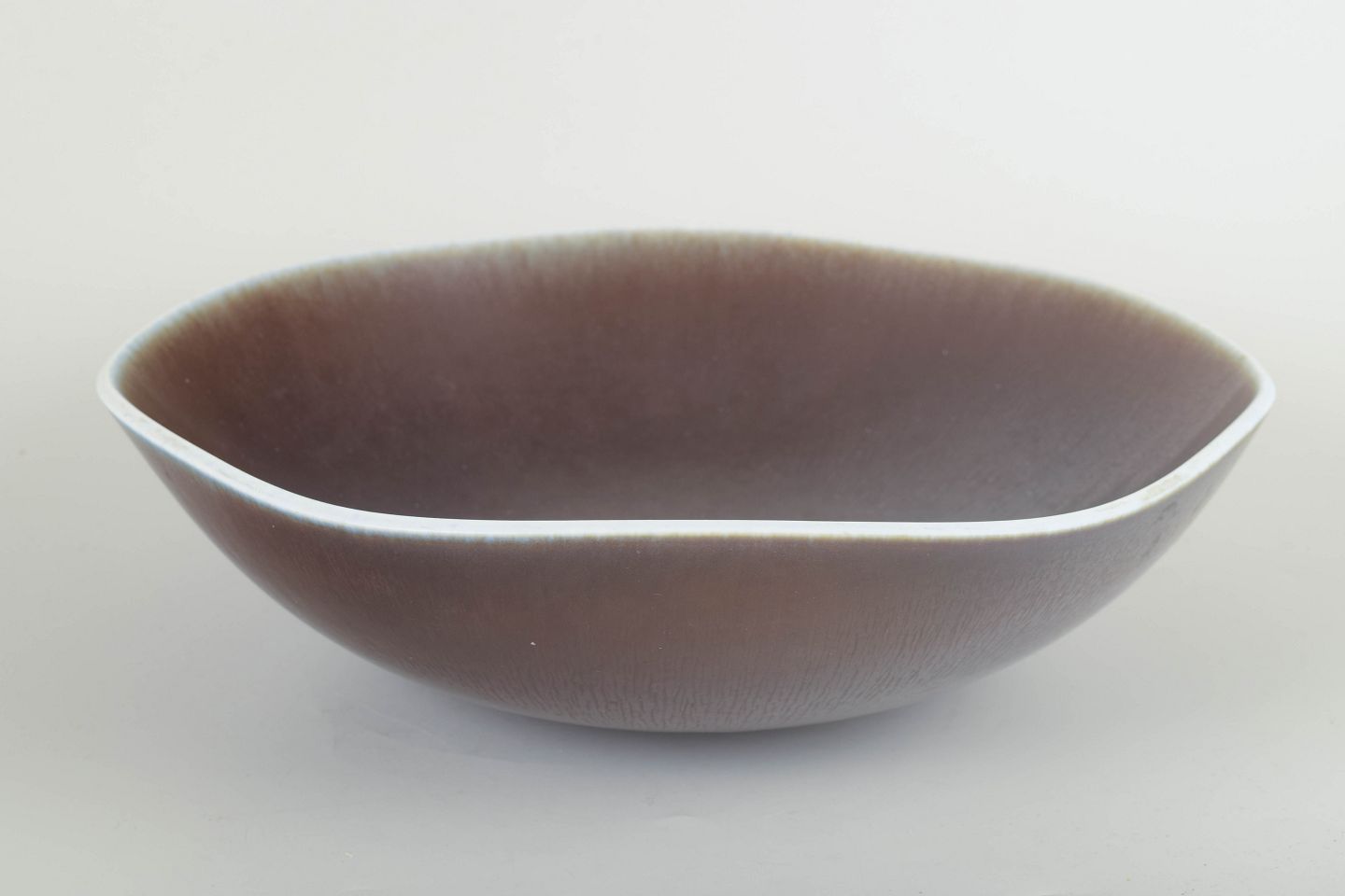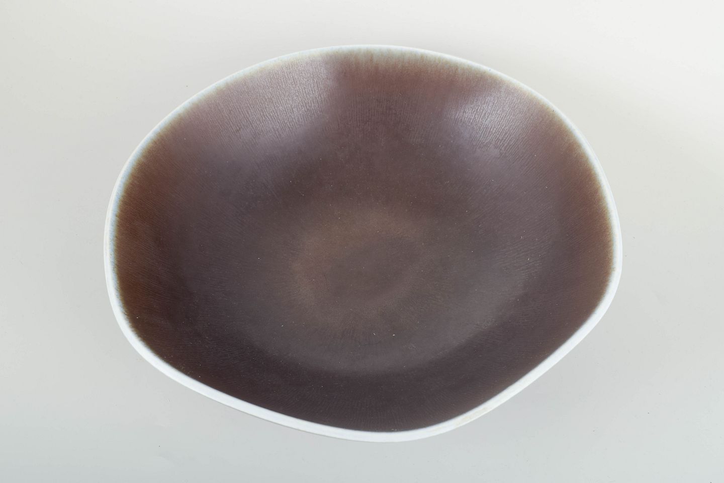Elegant hånddrejet stor stentøjsskål med karakteristisk harepelsglasur i brunlige toner og fint markeret hvid kant. Formen er blødt organisk og afbalanceret, som kendetegnende for Fribergs mestrede proportioner og subtile overflader. Signeret ‘Friberg’ med Gustavsbergs værkstedsmærke under bunden.