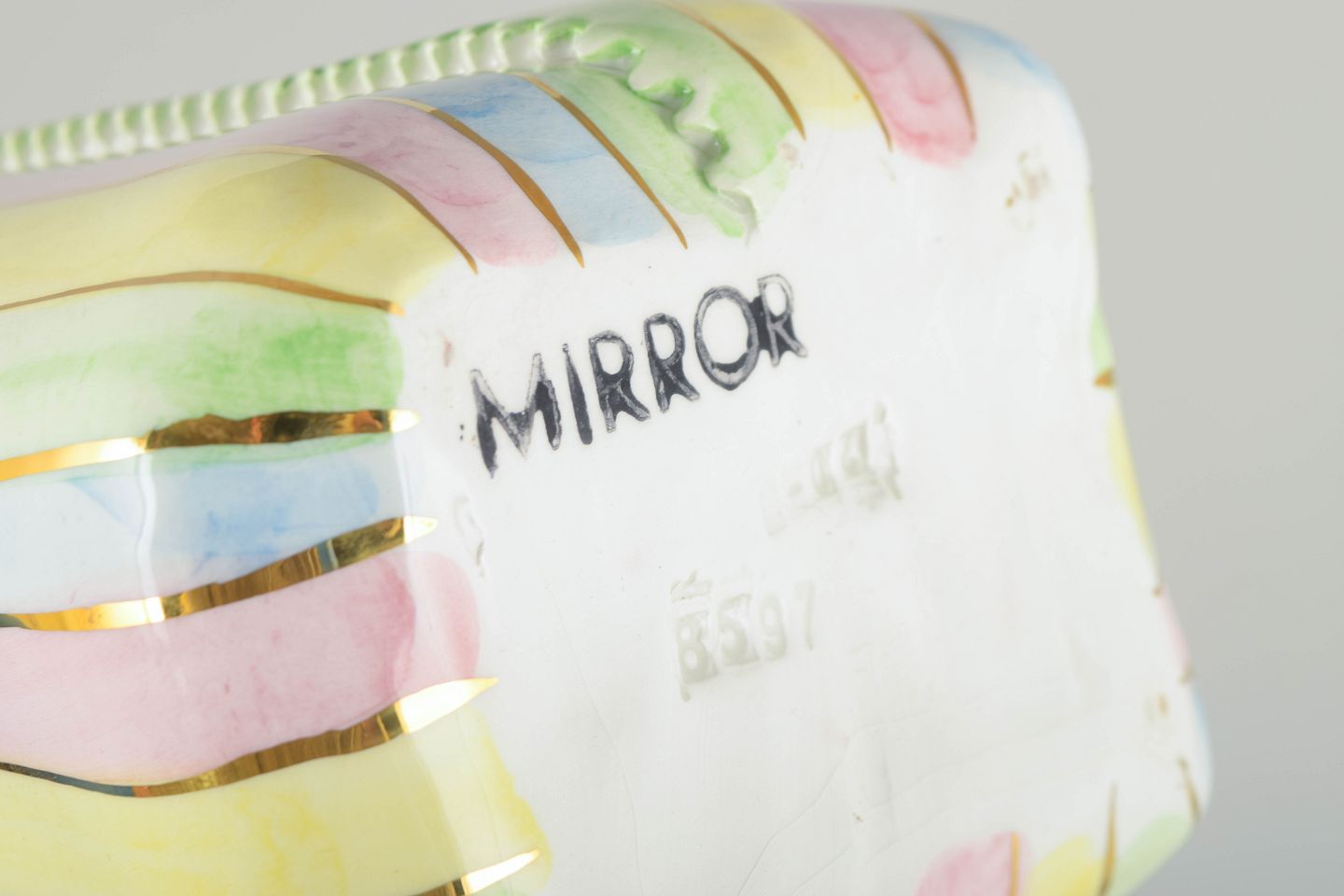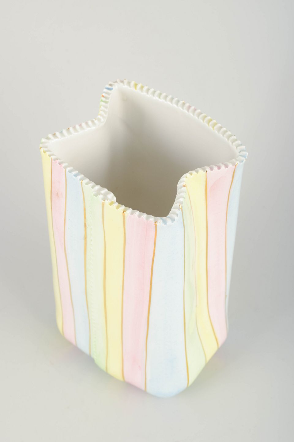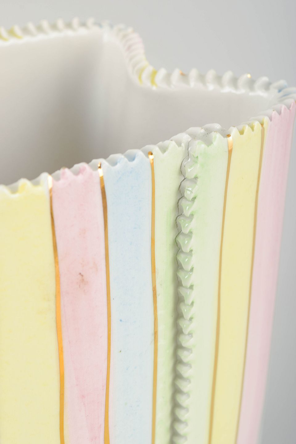 Håndmalet vase i keramik med lodrette farvefelter i bløde pasteltoner af rosa, gul, blå og grøn, afsluttet med en bølget kant og let asymmetrisk form. Et legende og dekorativt udtryk, typisk for tidens eksperimenterende skandinaviske studiokeramik.