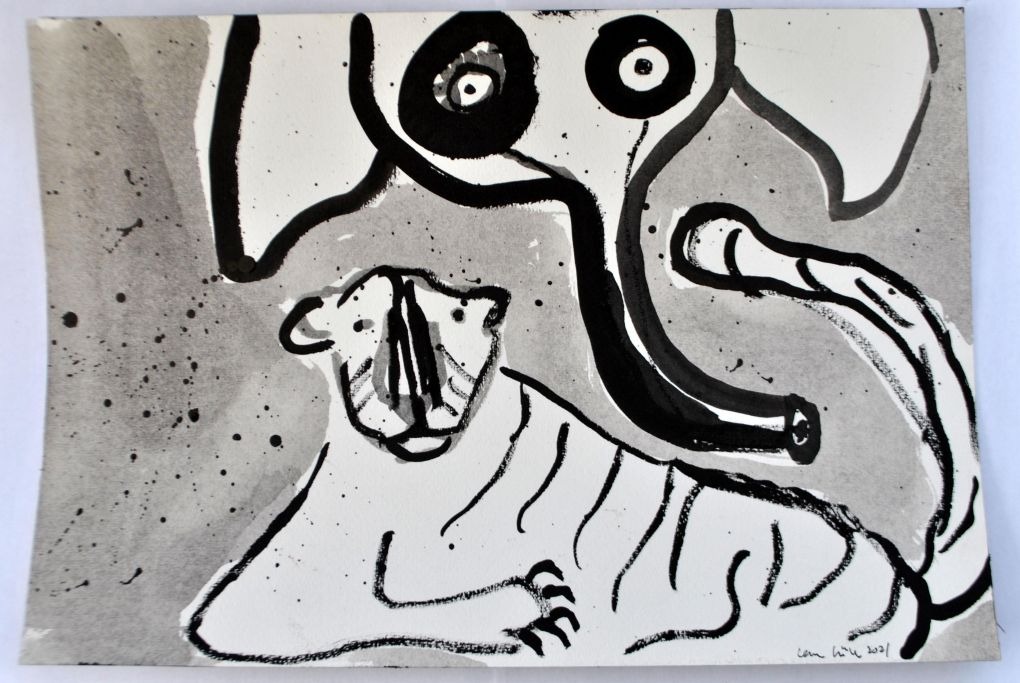 Kühl, Lena (1950 -) Danmark: Tiger og elefant, 2021. Tusch på papir. Signeret: Lena Kühl 2021. H. 25 cm. B: 36 cm.