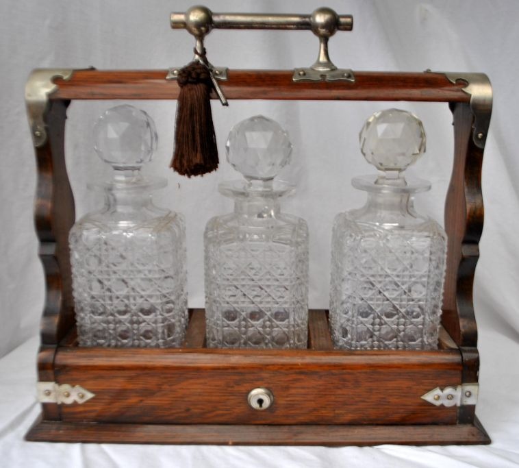 English tantalus with three crystal decanters, 19th century. Polished oak. With silver-plated fittings and lock with key. H: 34 cm. L: 38 cm.