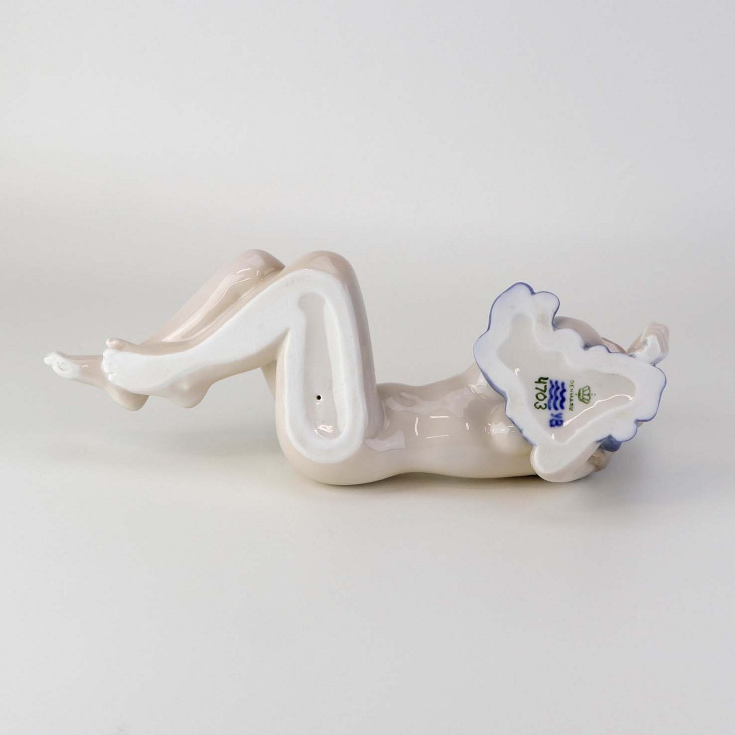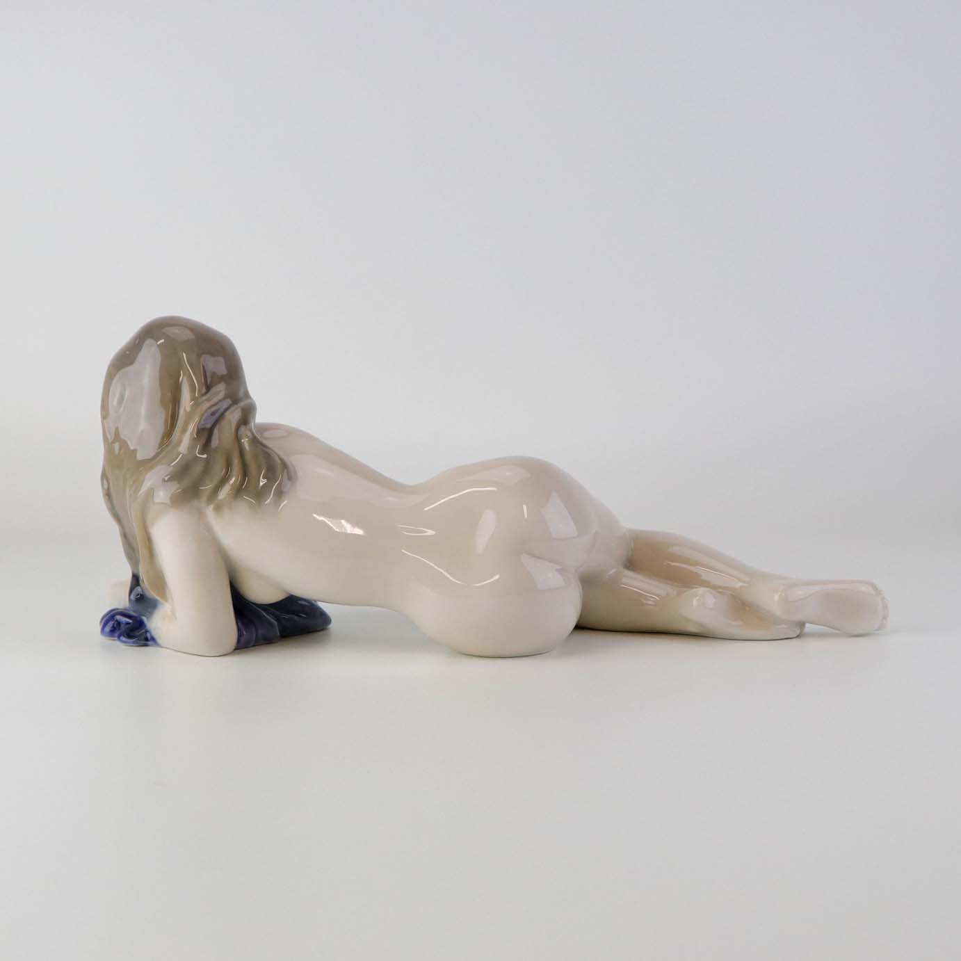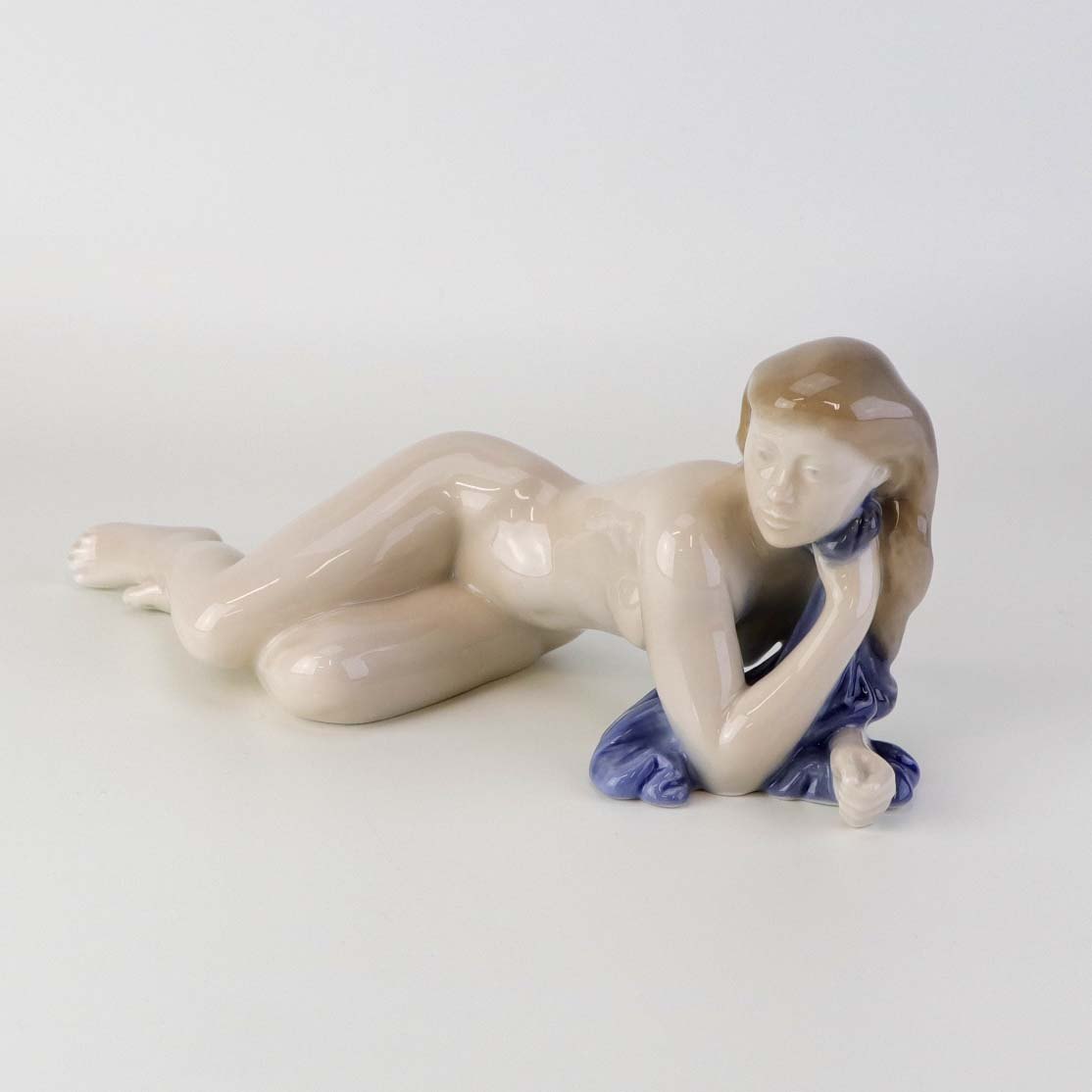 Figur i porcelæn med motiv af liggende nøgen kvinde med blåt klæde. Nr. 4703