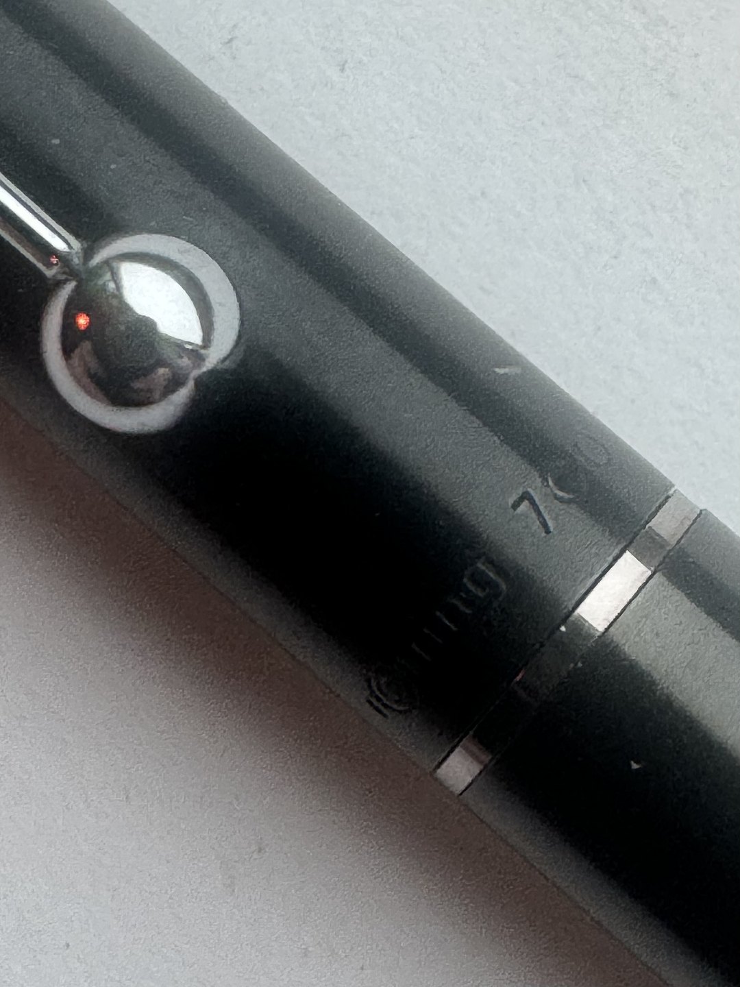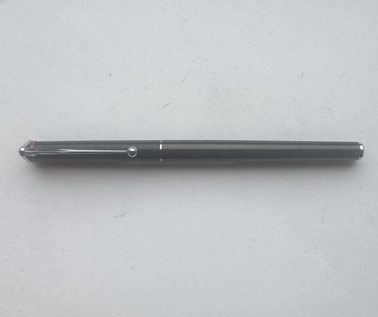 Rotring 700 fyldepen i stål fra 1990’erne. Fremstår i god og skriveklar stand. Mangler blot ny blæk-patron (cartridge) for at kunne skrive igen. Længde 14 cm.