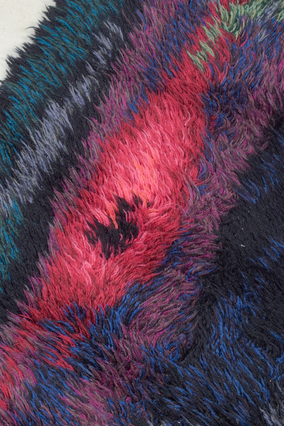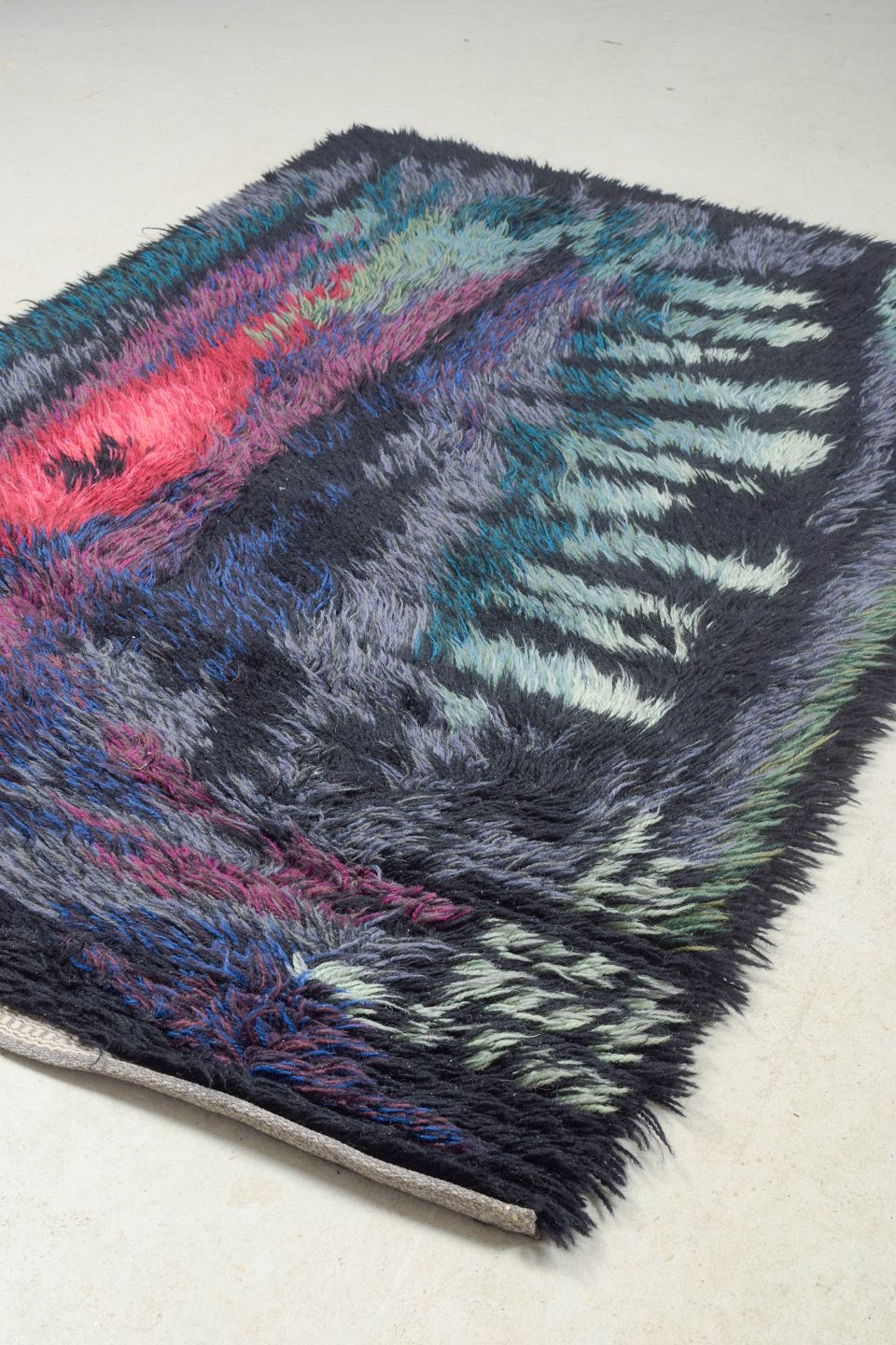 Hand-knotted rya carpet in pure wool designed by Ingrid Starling. An expressive and vibrant piece with an abstract composition in deep blue, turquoise, green, and pink tones. The carpet reflects the artistic freedom and colour experimentation characteristic of Swedish textile art during the period.
