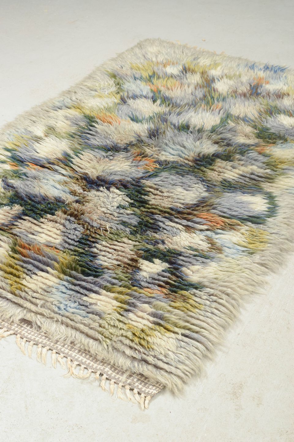 Hand-knotted rya carpet in wool with a lush, organic composition in blue, green, grey, and earthy tones. A decorative and vivid textile typical of Scandinavian design from the period, where natural inspiration and colour play were central themes in interior design.