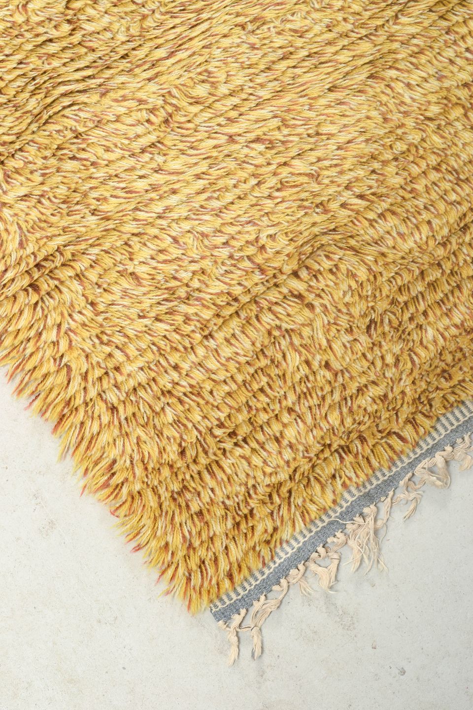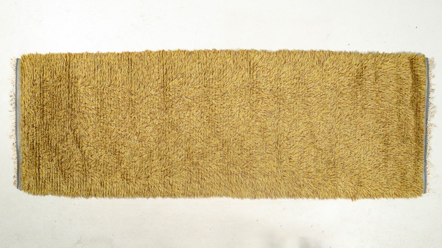 Hand-knotted rya runner in pure wool in a golden mustard shade. An elegant and period-typical textile with dense pile and a simple colour palette, suitable for hallways or as a decorative accent in modern interiors.