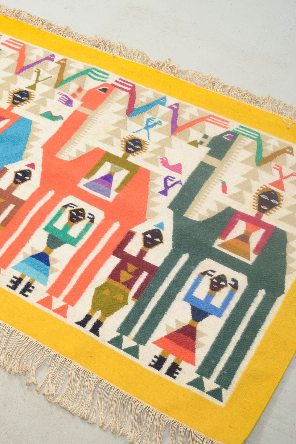 Håndvævet rölakan-vægtæppe i uld med et farverigt, figurativt motiv i stærke toner af gul, blå, rød, grøn og lilla på sennepsgul bund. Et karakteristisk eksempel på 1970’ernes svenske vævekunst, hvor traditionel rölakan-teknik blev brugt i dekorative og kunstneriske kompositioner.