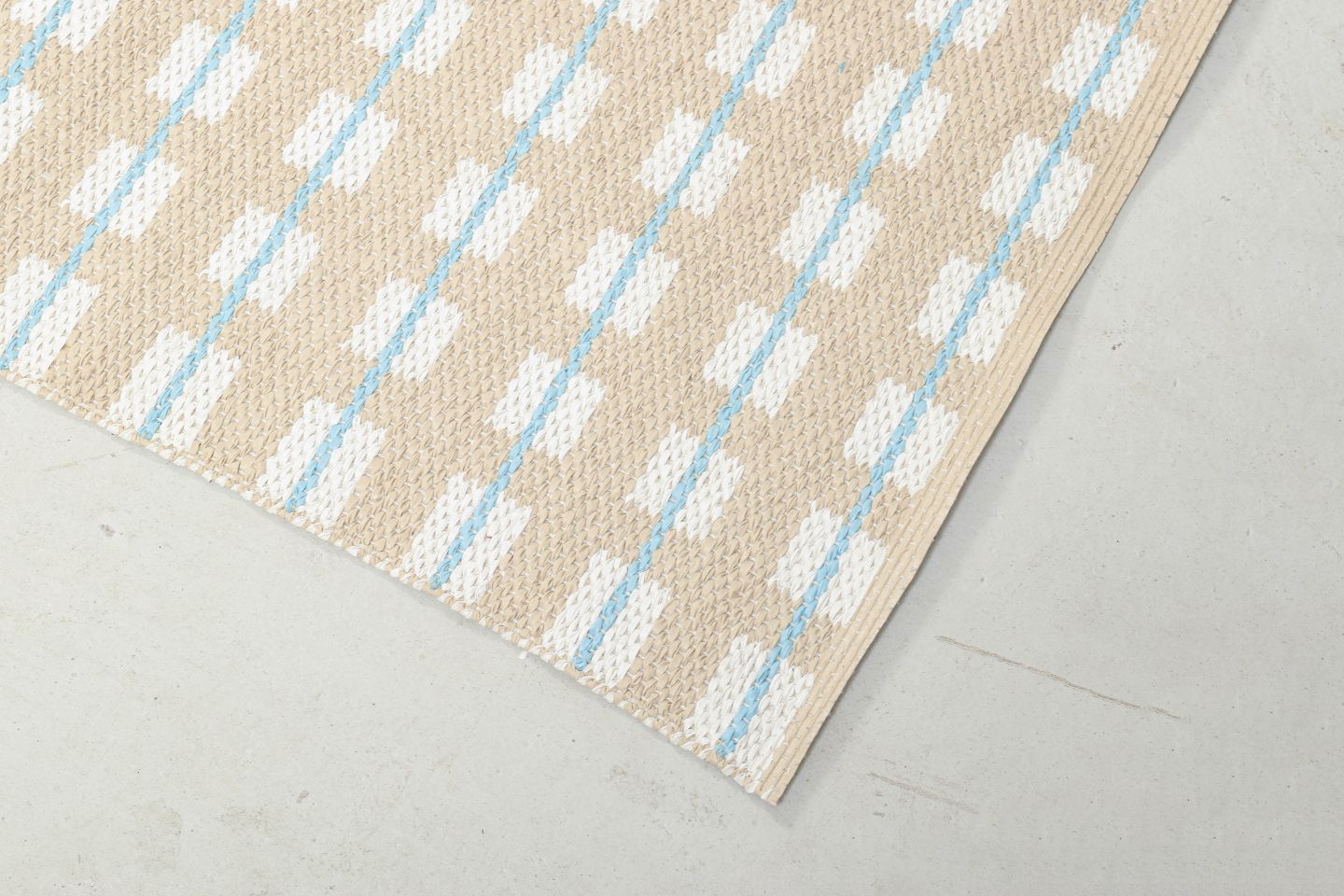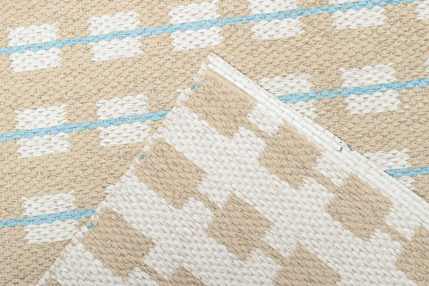 Rectangular table runner in woven plastic with a graphic pattern in beige and light blue tones, typical of the functional and colourful interior design of the 1970s.