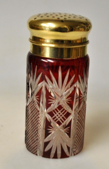 Antik bømisk sukker strøbøsse, 19. årh. Krystal med messing låg. H.: 12 cm.