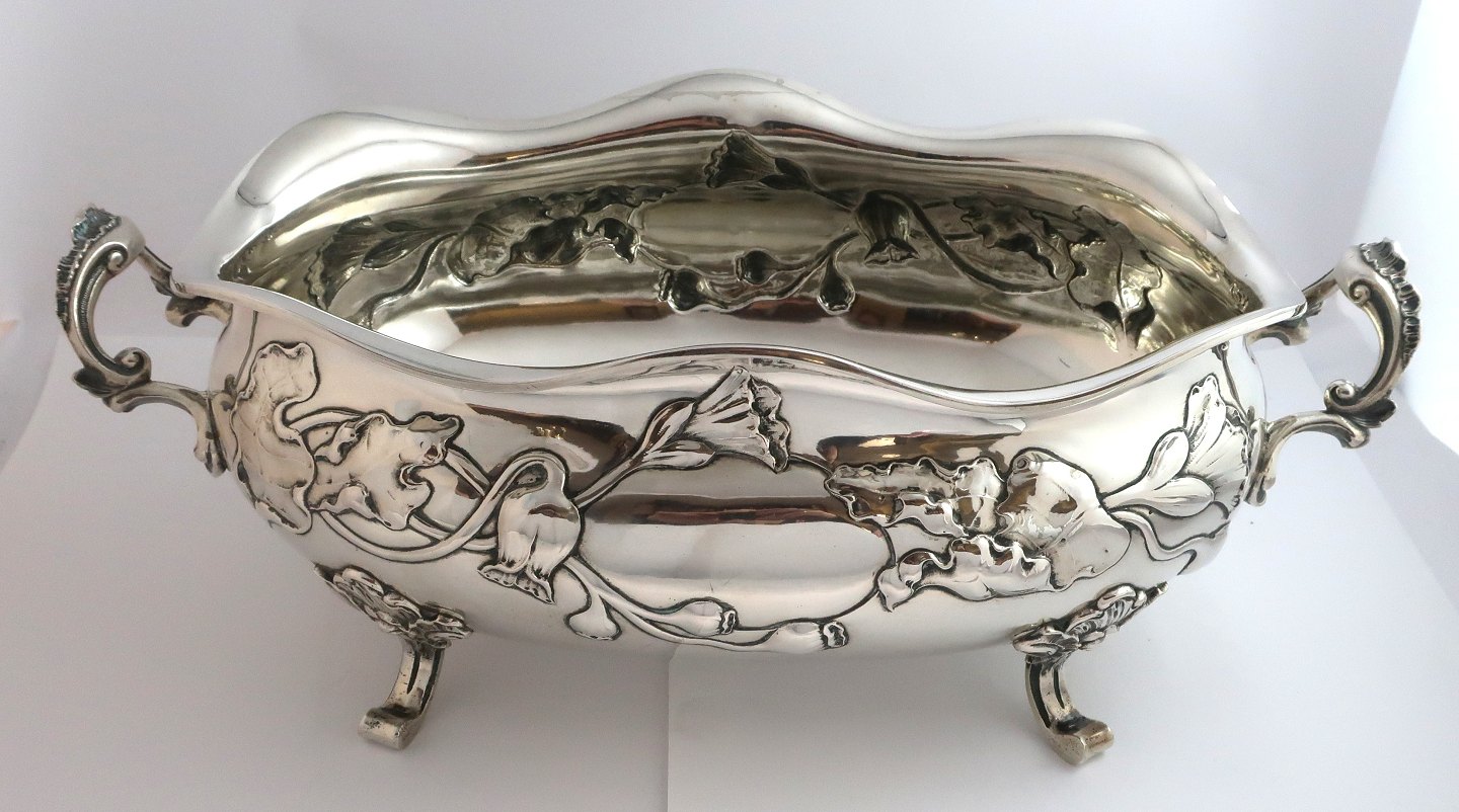 K. C. Hermann, København. (KCH). Stor sølv jardiniere i art nouveau stil (830). Længde 45 cm. Bredde 23,5 cm. Højde 15 cm. Produceret 1907