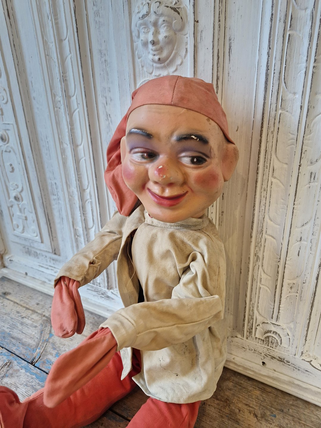 Stor gamle fin butiks nisse, hovedet er fremstillet i håndmalet keramik, arme og ben kan bøjes.