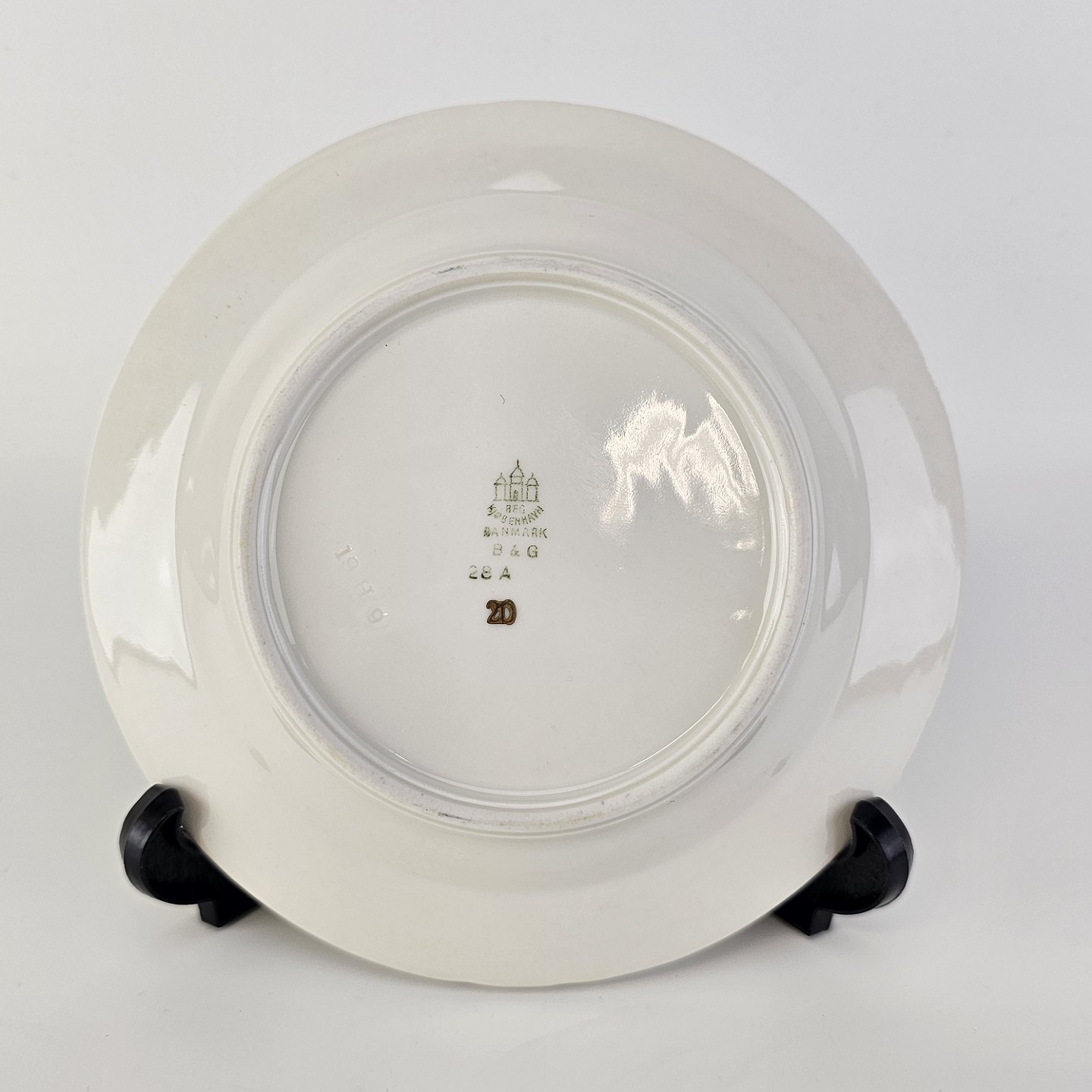 Tallerken i cremefarvet porcelæn med skælmønster og guldkant med blomstermotiv