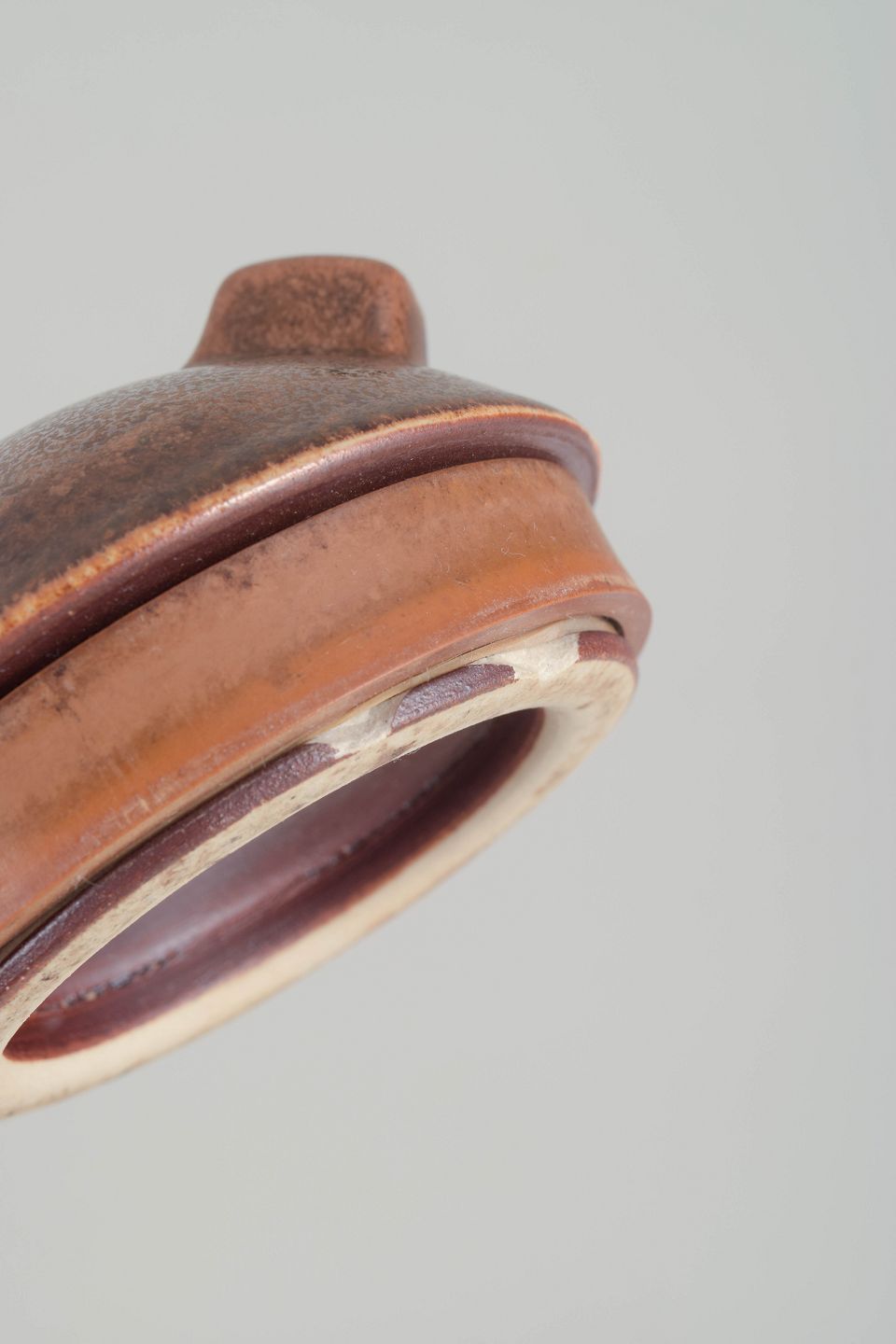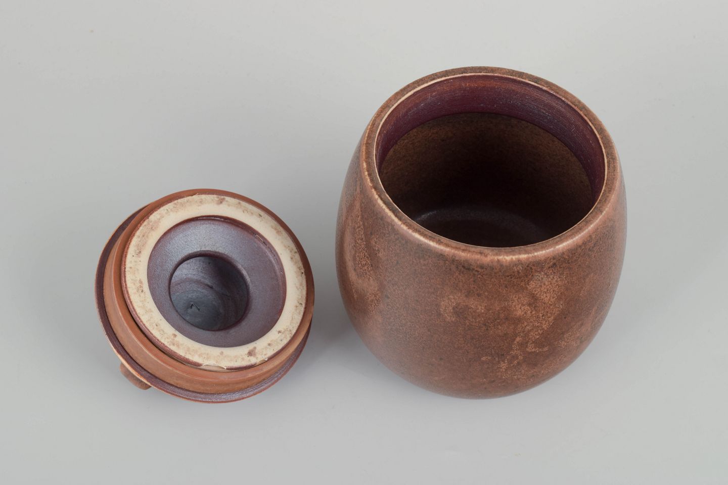 Organisk formet lågkrukke i stentøj med mat brun glasur i varme jordtoner. Låget har to små greb, typisk for Saxbos funktionelle og skulpturelle formsprog. Et enkelt og harmonisk eksempel på Rahrs arbejde for Saxbo.