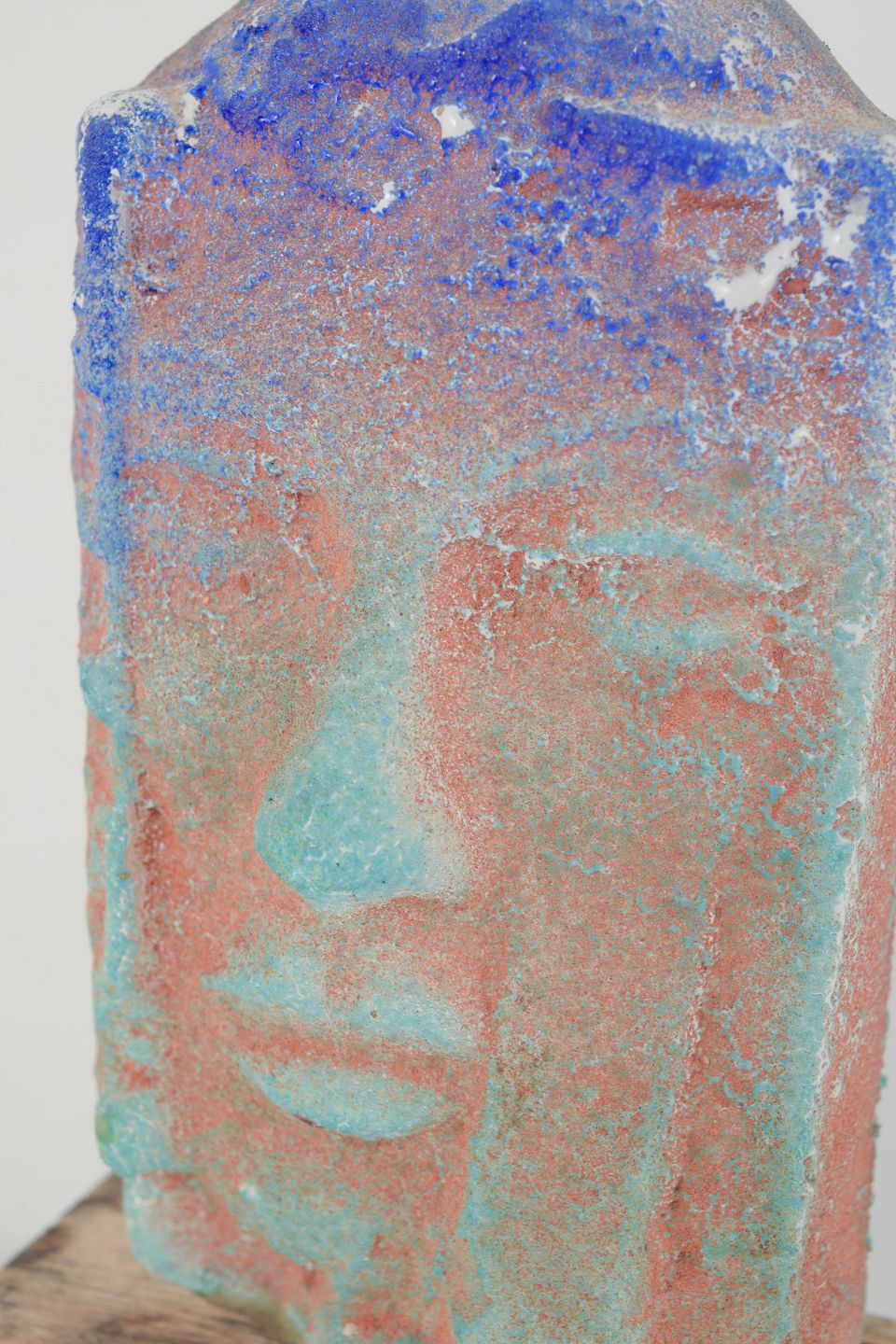 Unika, håndlavet glasskulptur med stiliseret ansigt, udført i massiv glas med iriserende overflade i blå, turkis og rosa toner. Monteret på træfod. Et karakteristisk eksempel på Ekegrens eksperimenterende arbejde med farve og struktur i glas fra 1980’erne.