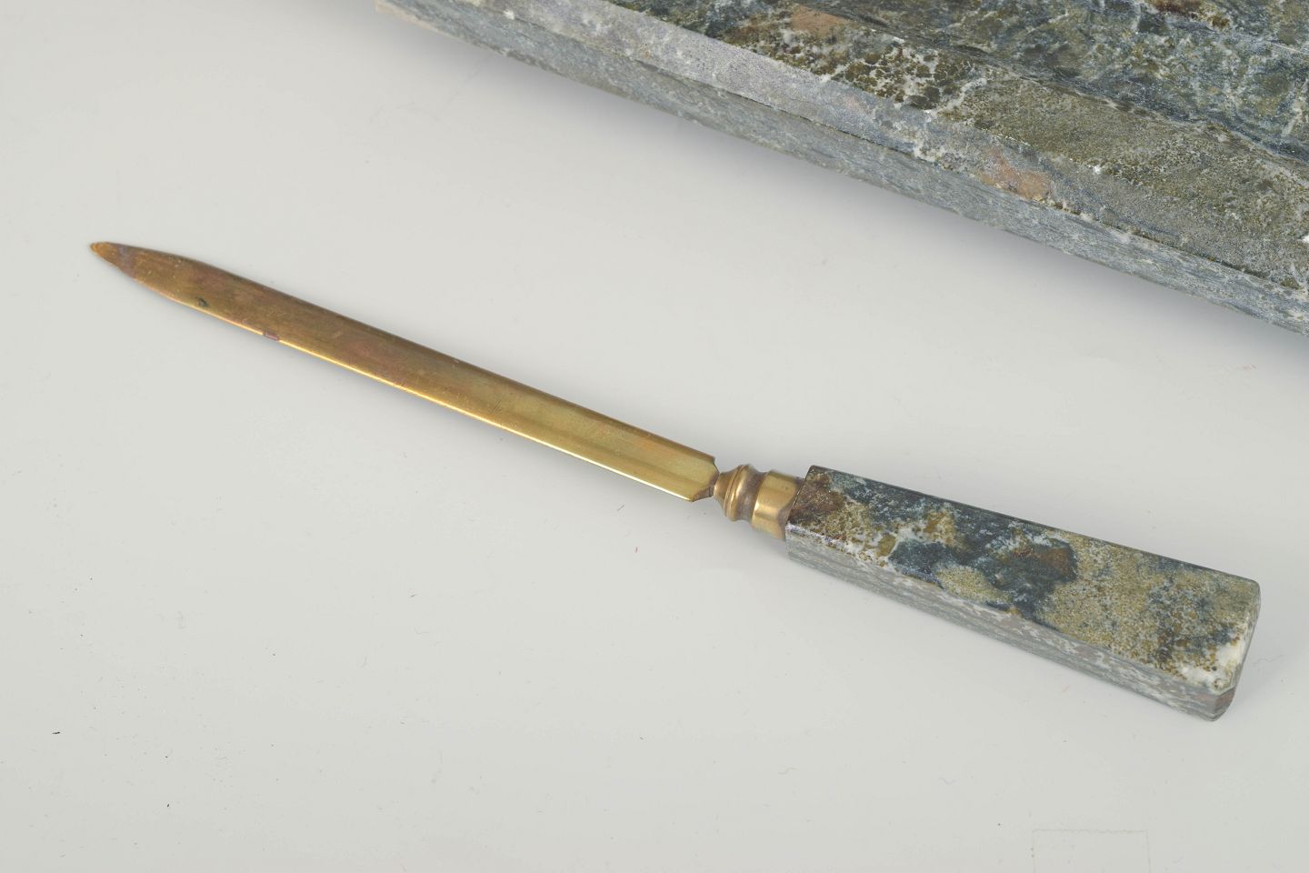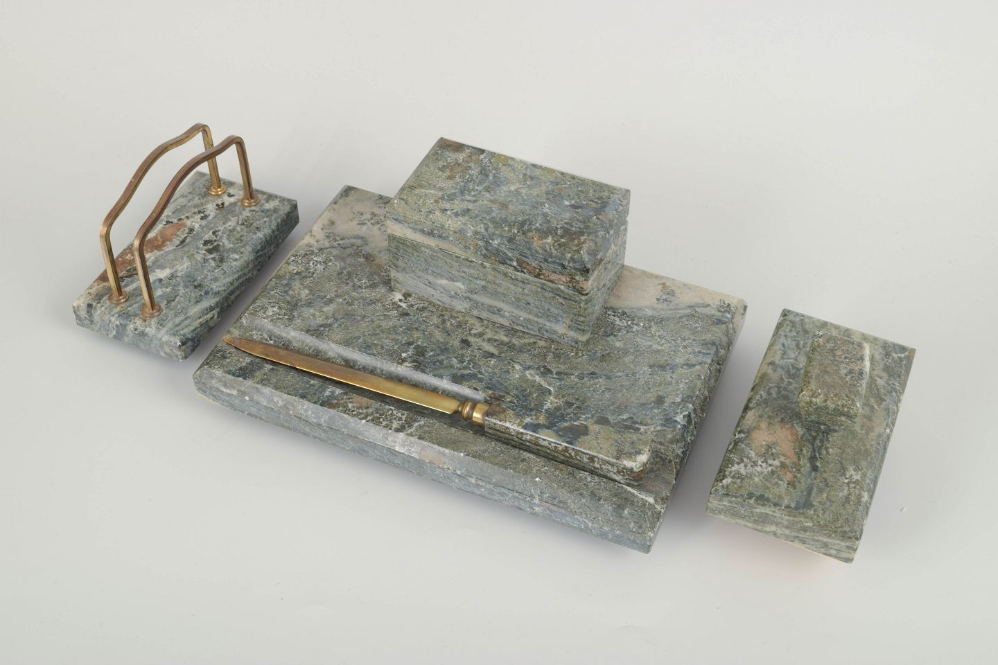 Elegant skrivebordssæt i grågrøn marmor bestående af brevholder, brevkniv, blækholder og blæksuger. Udført med messingdetaljer og karakteristisk skandinavisk modernistisk formsprog. Et funktionelt og dekorativt sæt, der vidner om tidens sans for ædle materialer og håndværksmæssig kvalitet.