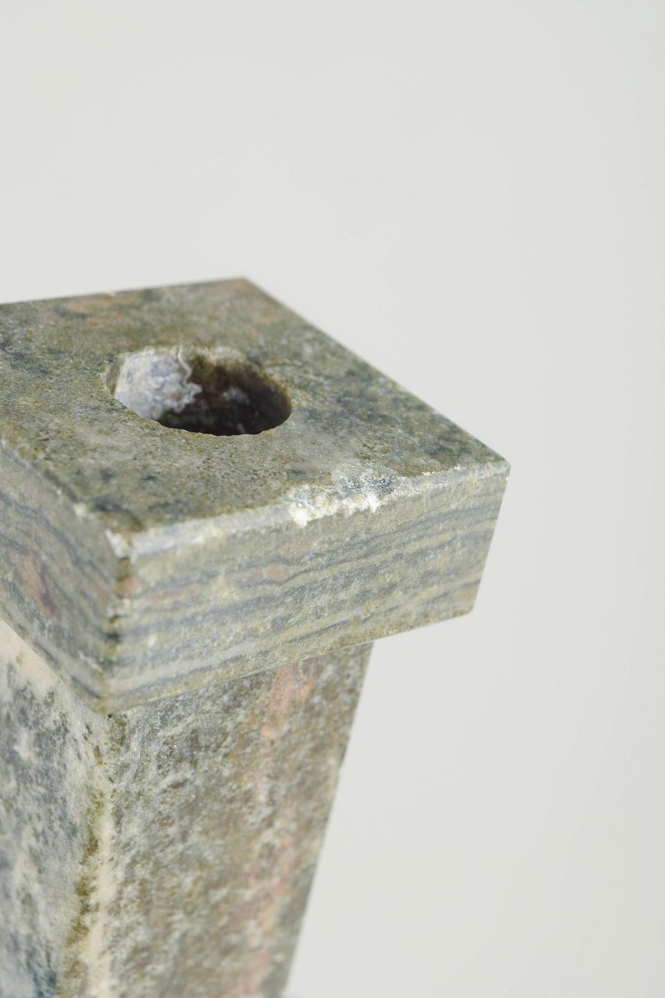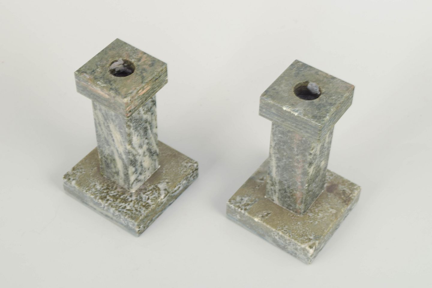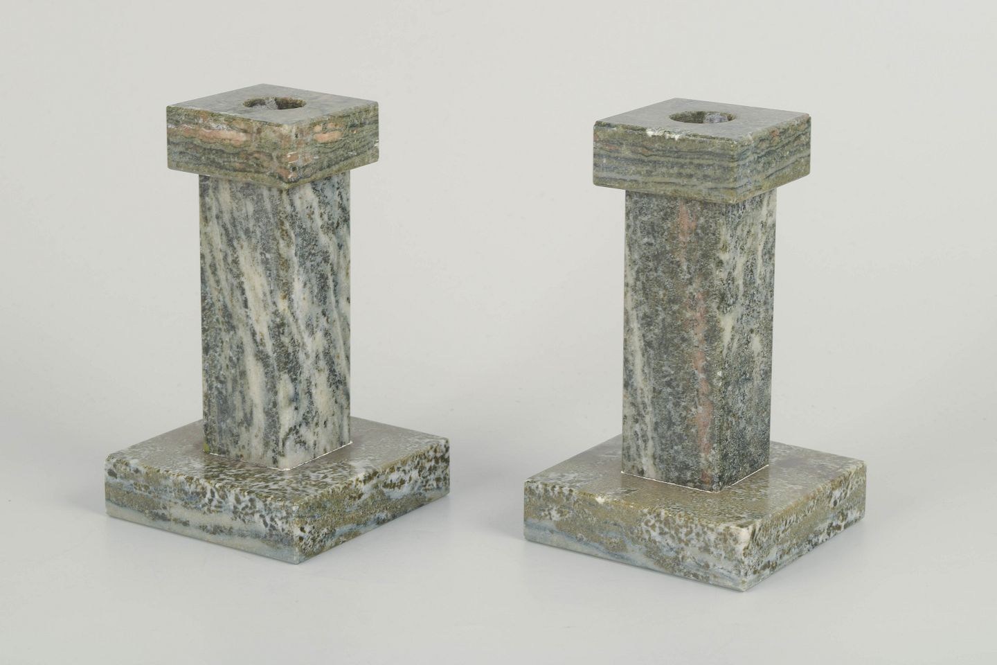 Par marmorstager i grå- og grønmeleret sten med geometrisk, minimalistisk formgivning. Håndforarbejdede med elegant proportioneret fod og top.