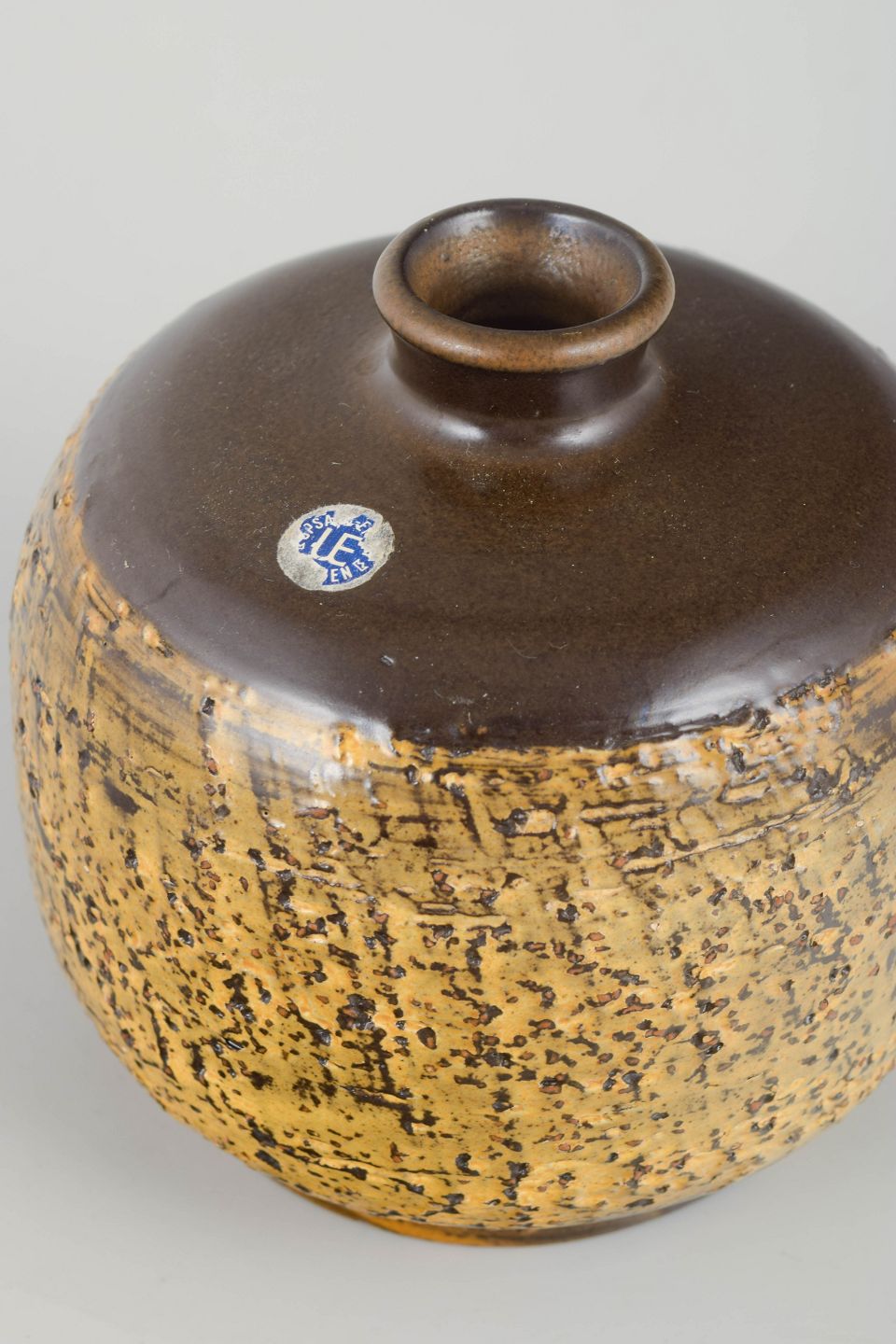 Hånddrejet stentøjsvase med cylindrisk korpus og lille hals, dekoreret med en levende gulbrun glasur med mørke teksturelle spor, der giver overfladen en markant, rustik karakter. Et klassisk eksempel på Anderssons håndværk og den eksperimenterende glasuræstetik hos Upsala Ekeby i 1960’erne.