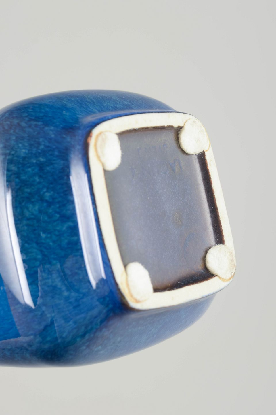 Rektangulær vase i stentøj med håndpåført blå laguneglasur i levende nuancer af azur, kobolt og gråtoner. Et klassisk eksempel på Gustavsbergs forfinede glasurarbejde fra perioden, hvor modernistiske former blev kombineret med dyb, sanselig farvevirkning.