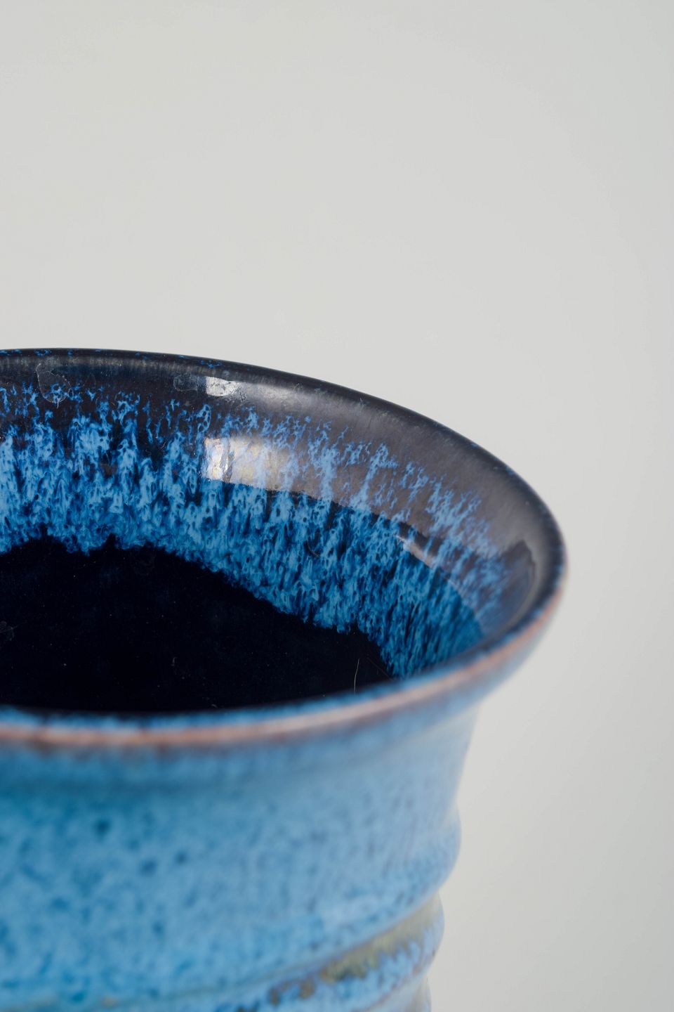 Hånddrejet keramisk vase i stentøj med kraftig, glansfuld glasur i nuancer af turkisblå og brun. Den foldede, teksturerede overflade giver vasen en skulpturel karakter og vidner om tidens eksperimenterende formsprog inden for nordisk studiokeramik.