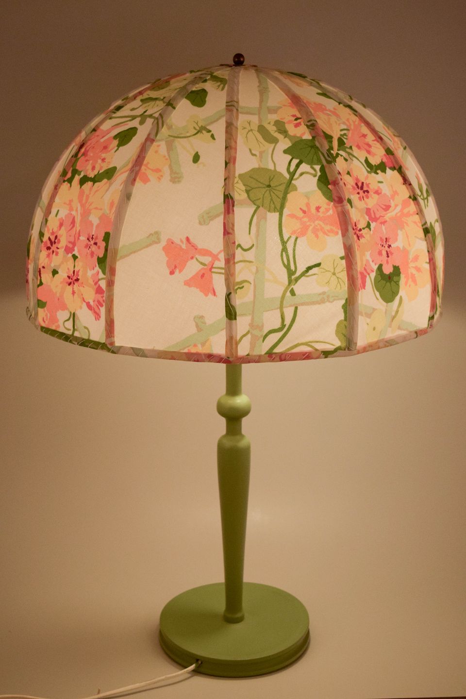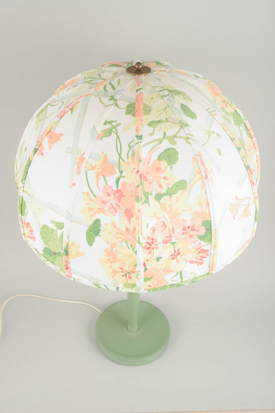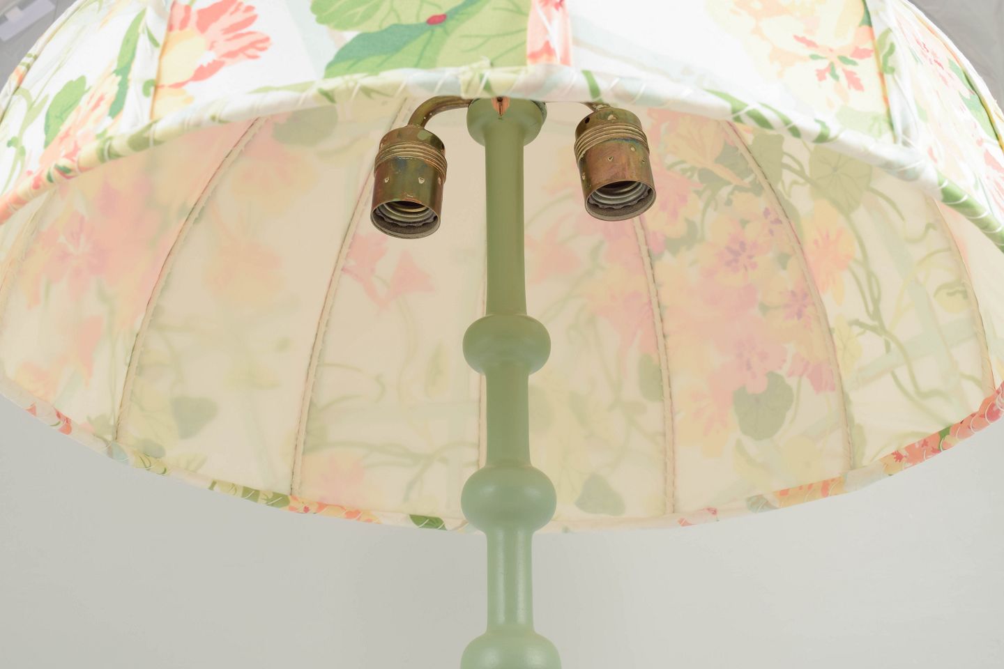 En sjældent smuk og tidstypisk bordlampe designet af Josef Frank for Svenskt Tenn. Lampen fremstår med en elegant kuppelformet skærm betrukket med et floralt tekstil i bløde pasteller, et mønster, der vidner om Franks enestående sans for farve og naturens formsprog. Den slanke, drejede fod i grønlakeret træ skaber en harmonisk balance mellem klassisk håndværk og organisk lethed. Et ikonisk og udsøgt eksempel på skandinavisk modernisme i sin mest poetiske form.