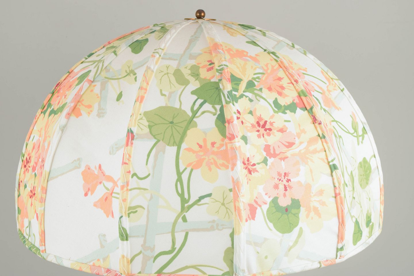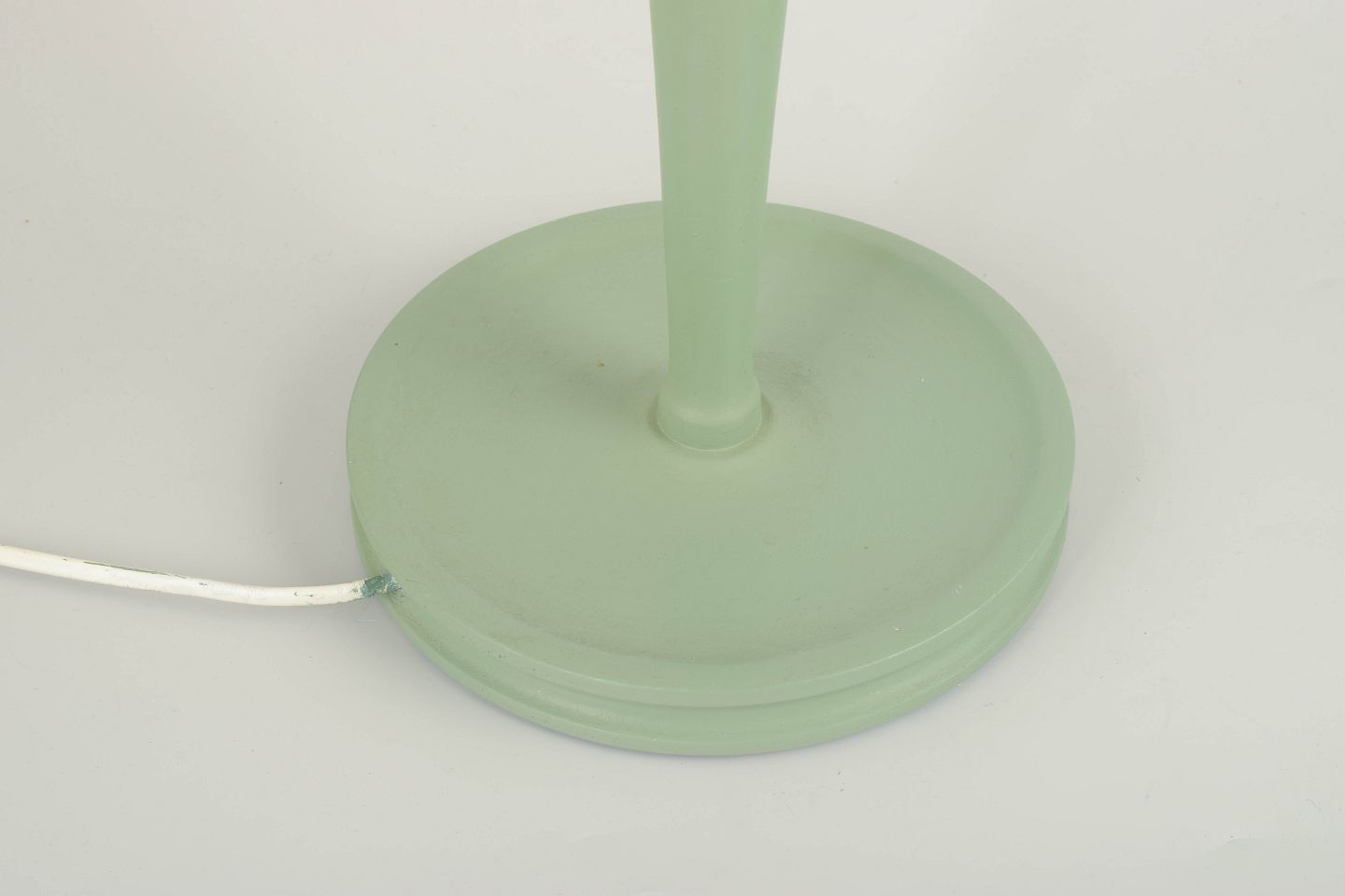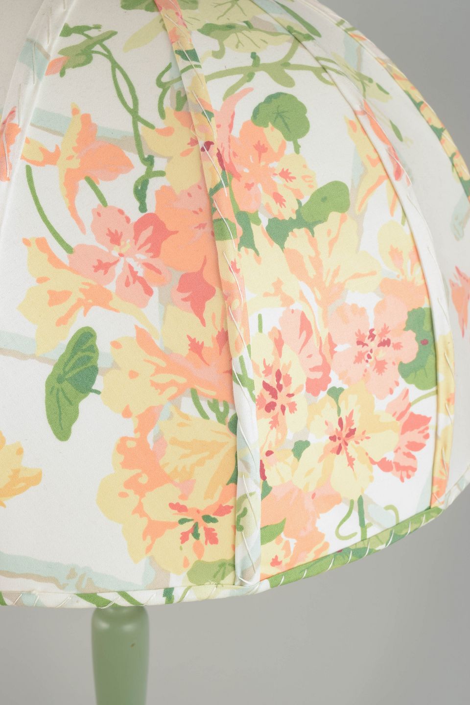 En sjældent smuk og tidstypisk bordlampe designet af Josef Frank for Svenskt Tenn. Lampen fremstår med en elegant kuppelformet skærm betrukket med et floralt tekstil i bløde pasteller, et mønster, der vidner om Franks enestående sans for farve og naturens formsprog. Den slanke, drejede fod i grønlakeret træ skaber en harmonisk balance mellem klassisk håndværk og organisk lethed. Et ikonisk og udsøgt eksempel på skandinavisk modernisme i sin mest poetiske form.