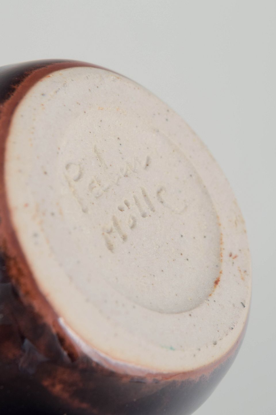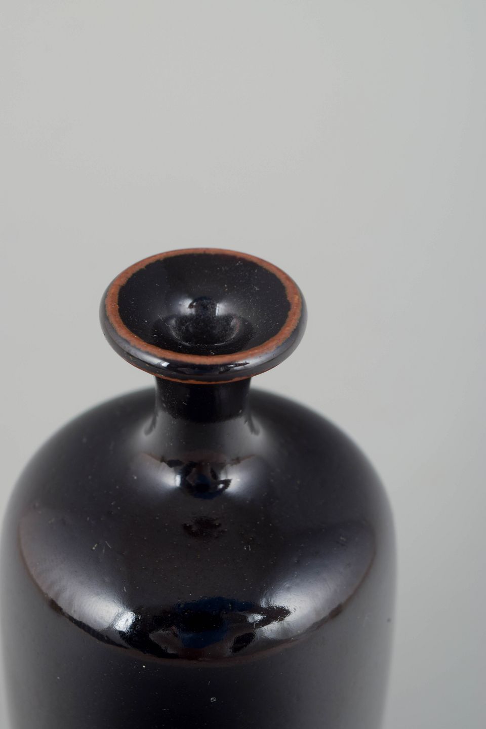 Unik hånddrejet miniaturevase i stentøj med mørk, blank glasur i dybe brun-sorte toner.