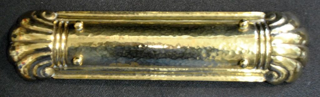 Brass pen holder, circa 1920. Denmark. Hammered brass. Ends in the shape of fans. On four small feet. L.: 33 cm. W.: 5 cm.